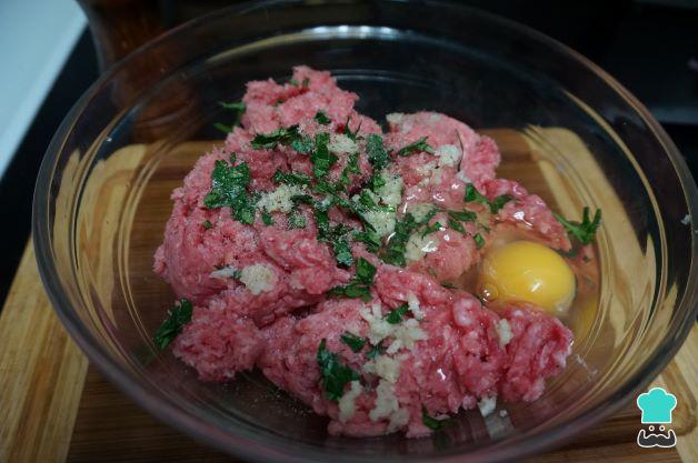 Para preparar las albóndigas con salsa de zanahoria empezaremos preparando la carne. Para ello, coloca la carne picada en un bol, añade un huevo, dos dientes de ajo picados, un puñado de perejil picado, un poco de sal y pimienta. Mezcla todo muy bien y deja un rato en la nevera para que adquieran todo los sabores.