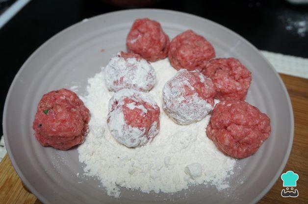 Prepara las albóndigas. Para ello, coloca la harina en un plato o una fuente, coger con las manos trozos de masa y forma las albóndigas, pasa por harina y reserva.