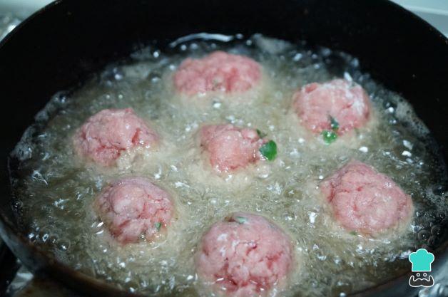 Fríe las albóndigas. Para ello, coloca en una sartén un buen chorro de aceite de oliva al fuego medio alto, fríe las albóndigas solo dorándolas por fuera y reserva en un plato. Luego se terminarán de cocinarse con la salsa.