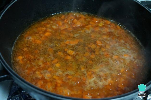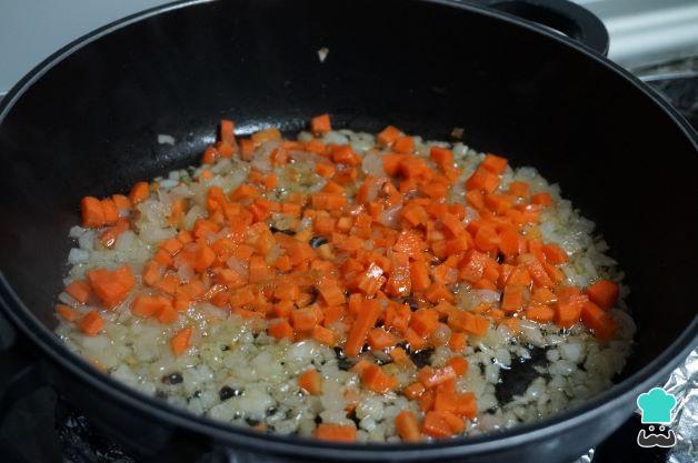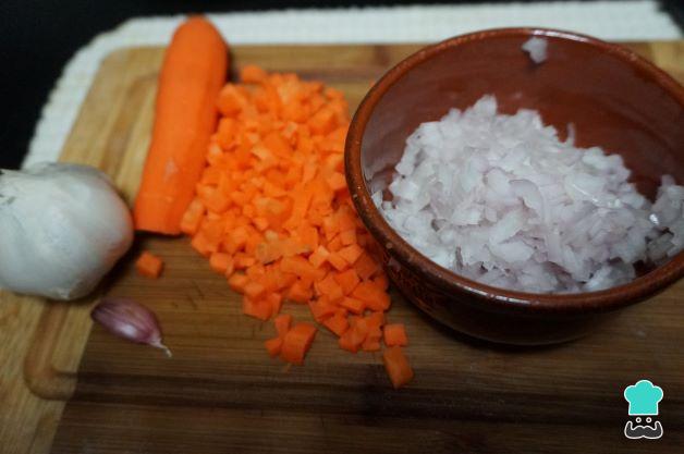 Corta finamente la cebolla y una zanahoria, las otras se pueden dejar para añadir en trozos más grandes o también las puedes poner en trozos pequeños.