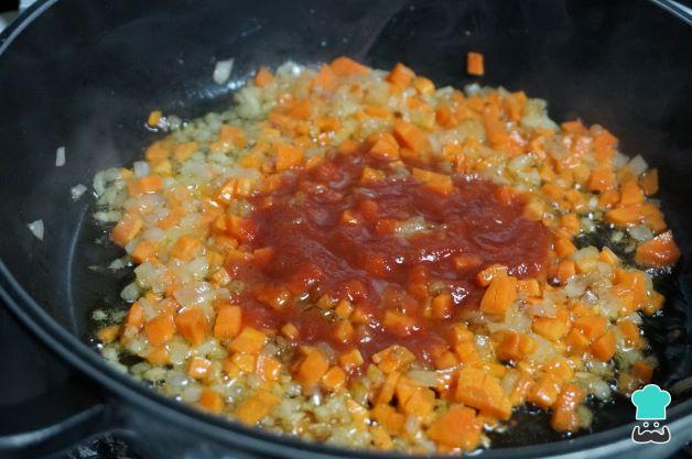 Cuando estén pochadas las verduras añade el tomate ydeja que se cocine unos minutos más
