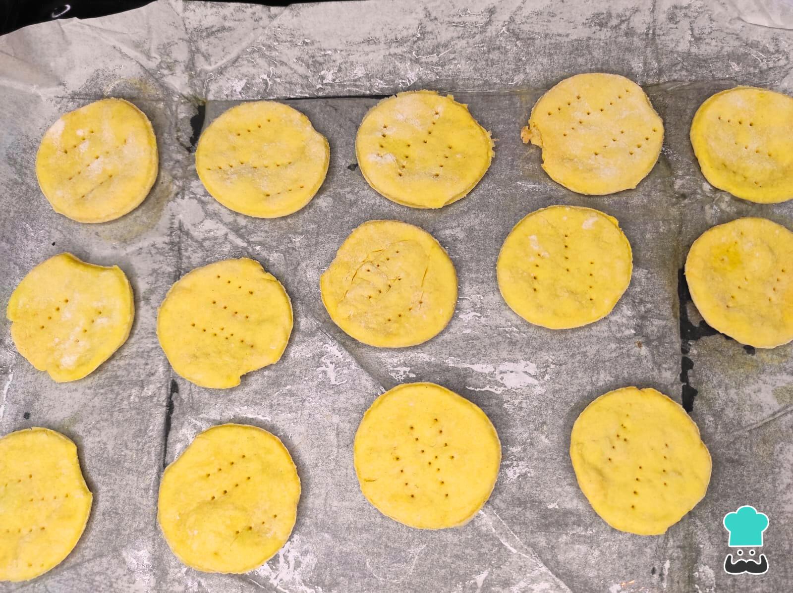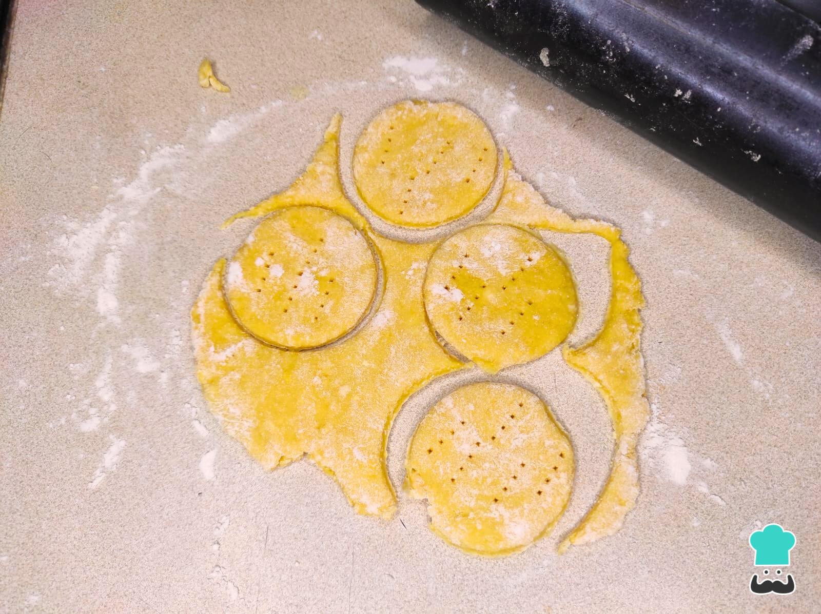 Estira con un uslero en una superficie enharinada formando una capa delgada. Corta círculos de aproximadamente 5 centímetros o del tamaño que gustes, pincha la superficie con un tenedor.