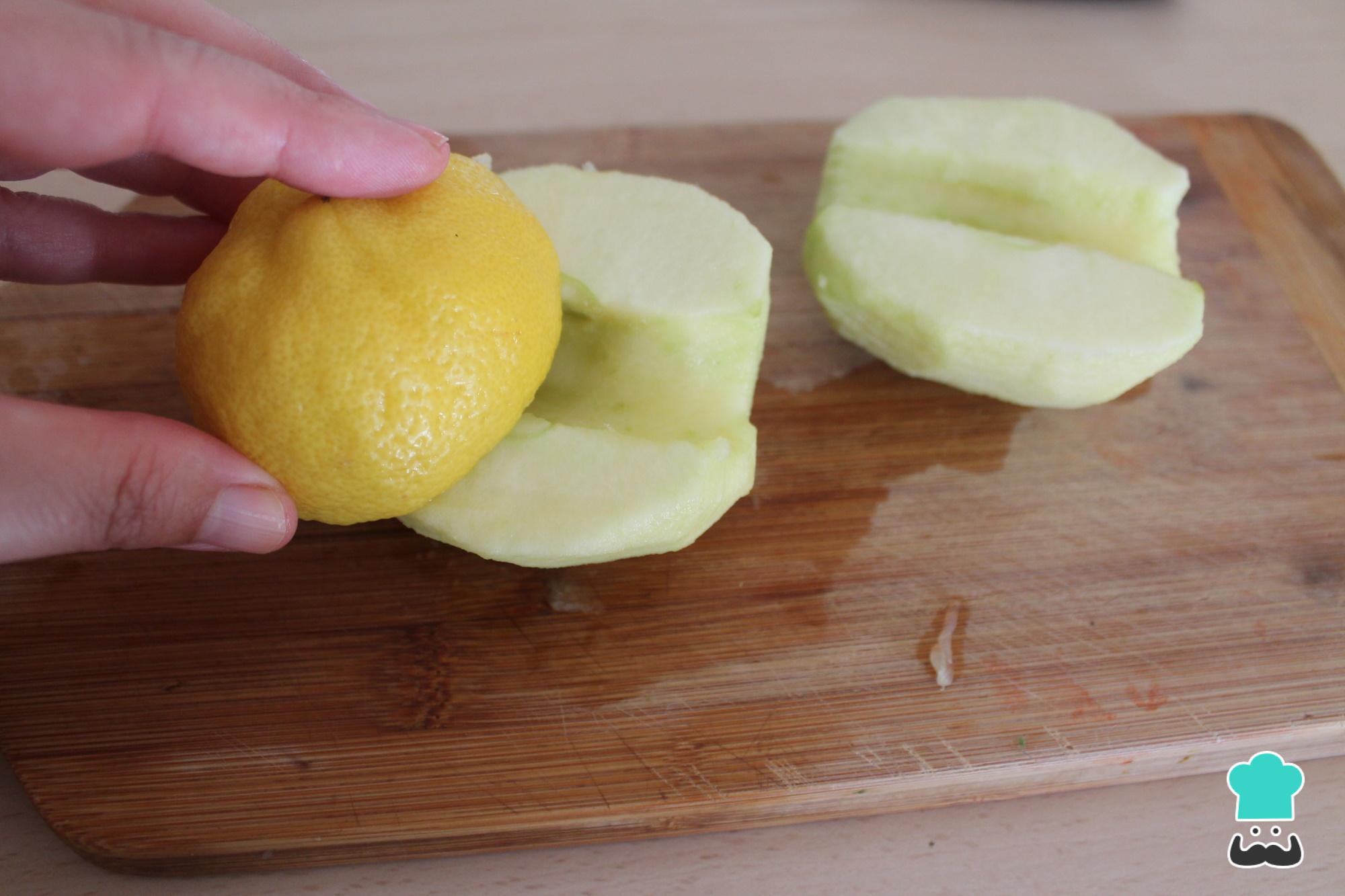 Para empezar con la receta de alioli de manzana, primero pela una manzana golden, descorazónala y córtala por la mitad. Frota bien medio limón por las dos mitades de la manzana para que no se oxide, pero lo justo para no enmascarar el sabor del alioli.