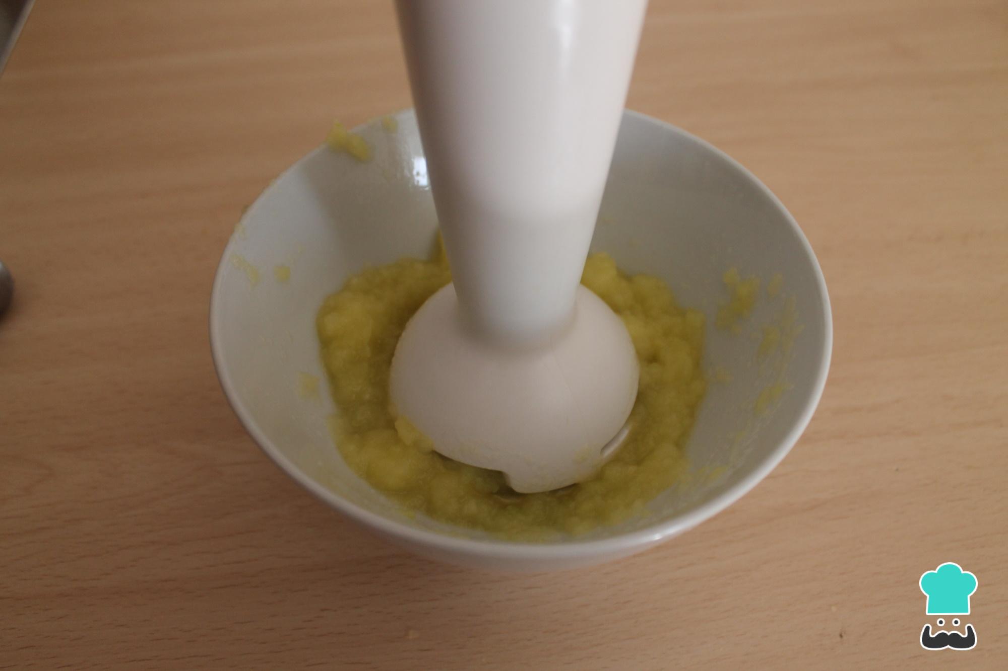 Cuando esté ligeramente cocida la manzana, tritura con la ayuda de una batidora eléctrica y deja enfriar el puré.