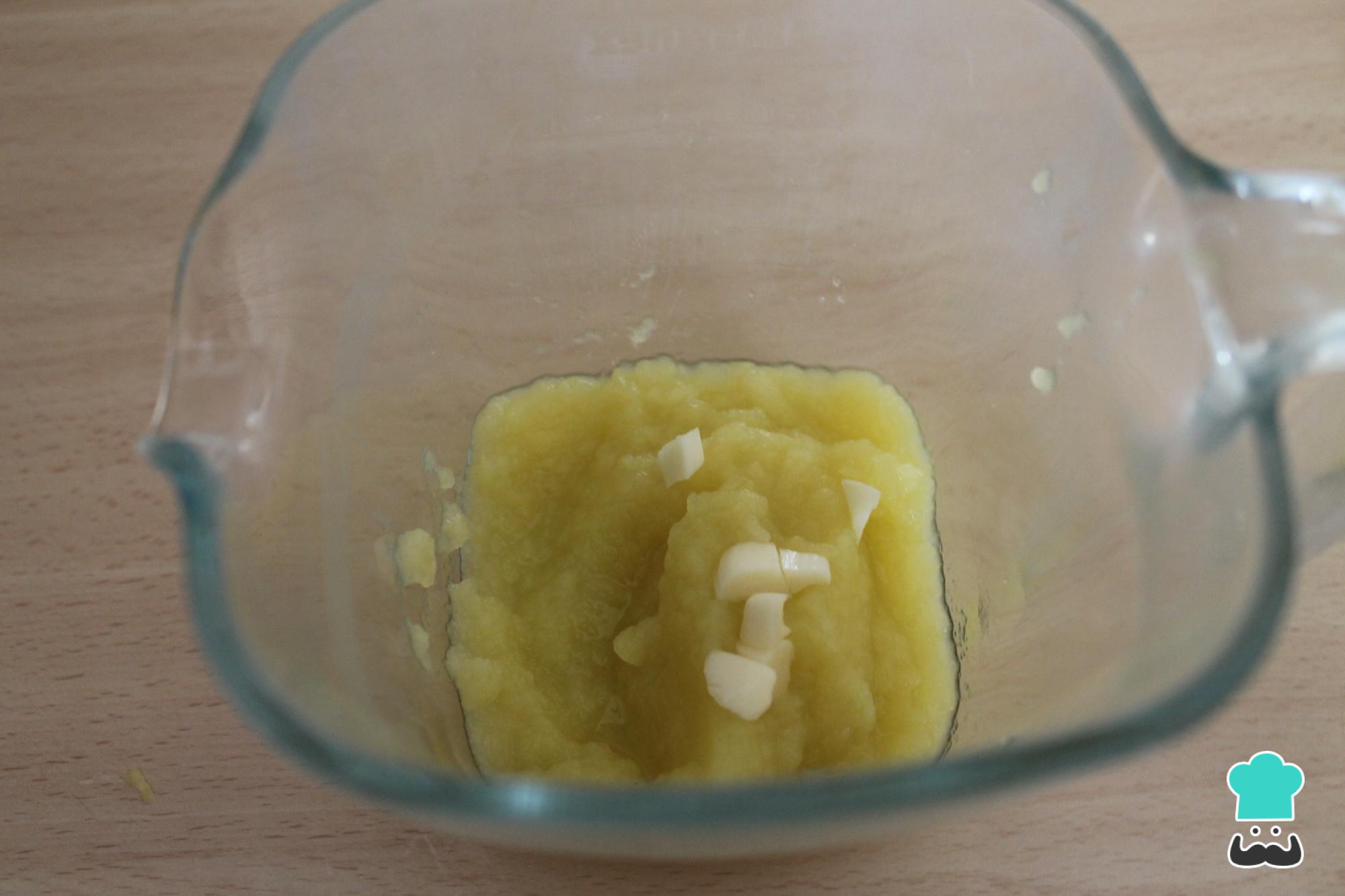 Una vez frío, introduce el puré en el vaso de la batidora. Pela el ajo, retira el germen para que no repita y trocea. Añade también el ajo picado junto con el puré.