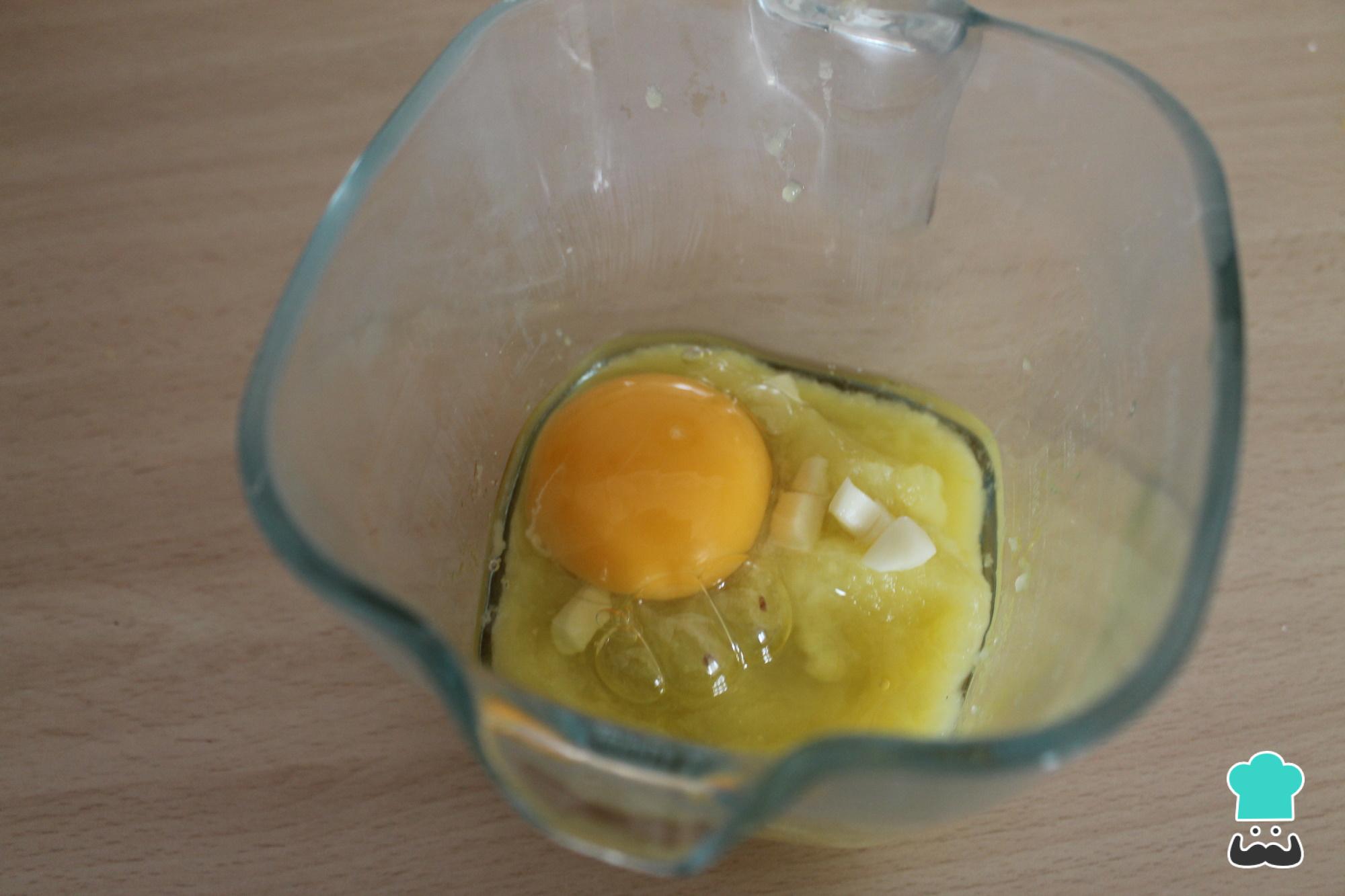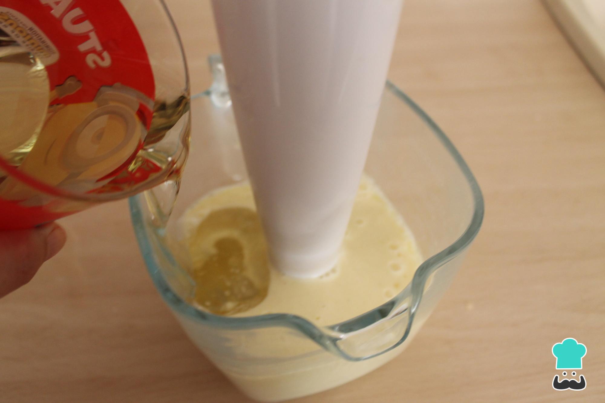 Añade gran parte del aceite de girasol. Pon la batidora en el fondo del vaso y bate poco a poco, sin apenas levantar la batidora, cuando veas que va cogiendo cuerpo ve añadiendo poco a poco el resto del aceite y sube un poco la batidora para emulsionar también la parte de arriba.