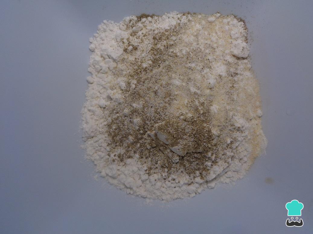 Ahora tomamos la harina de trigo, añadimos sal, pimienta y sal de ajo, mezclamos para integrar estos ingredientes perfectamente que emplearemos a modo de rebozado para la carne.