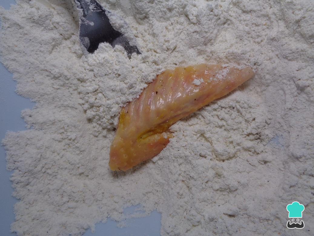 Así pues, rebozamos las alitas de pollo en la mezcla anterior de manera que queden bien cubiertas. Al estar bañada la carne en el jugo del limón, la harina combinada con especias quedará bien adherida.