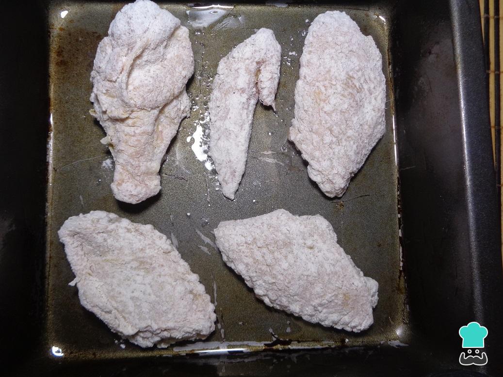 Una vez rebozadas todas las alitas, las colocamos en la bandeja para horno, la cual hemos cubierto con una delgada capa de aceite en aerosol para evitar que se peguen durante la cocción. Horneamos las alitas de pollo durante 40 minutos a 180 °C y, pasado este tiempo, las retiramos, les damos la vuelta y nuevamente las horneamos durante 20 minutos más.