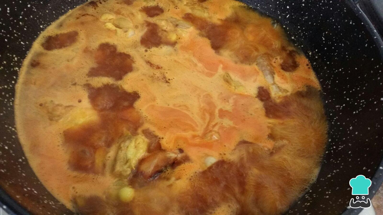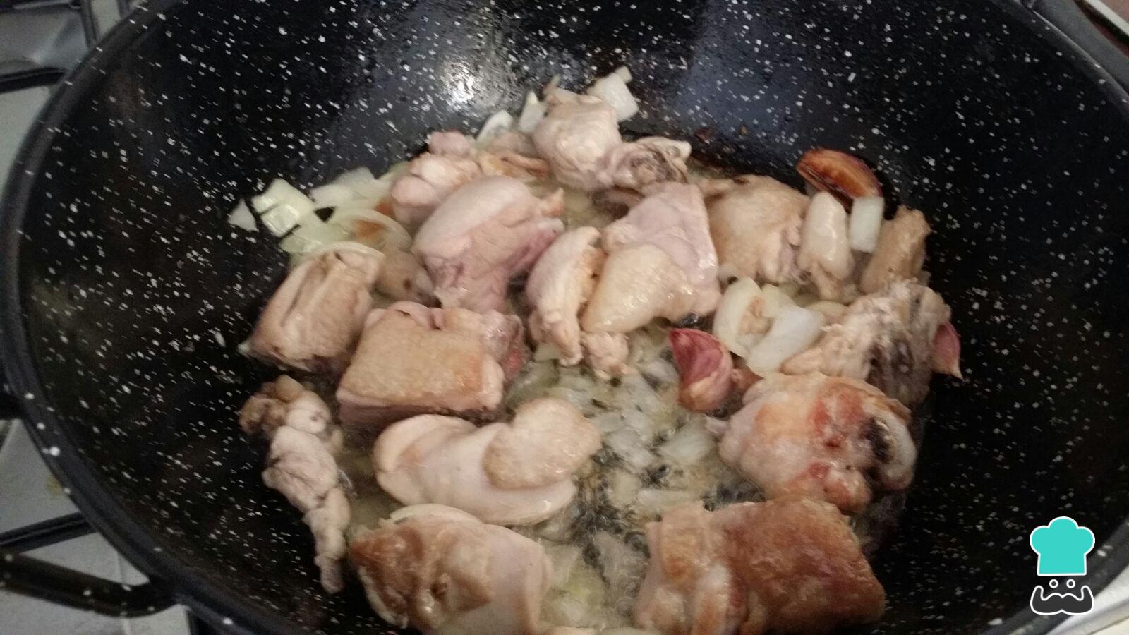 Aparte, en una cazuela se pone a freír la carne de pollo previamente limpia y troceada, se espolvorea por encima un poco de sal para que se pegue a la cazuela. Rehogamos la carne de pollo a fuego suave hasta que coja un color doradito, este paso es muy importante porque de esto dependerá el sabor a carne que tomen las alubias. Luego, se añade la verdura cortada en cuadraditos (previamente pelada): cebolla, pimiento rojo, zanahoria y 4 dientes de ajo. Se rehoga todo junto unos 5 minutitos y después se cubre todo con agua o caldo de pollo. Tapamos la cazuela y dejamos cocer unos 30 minutos.