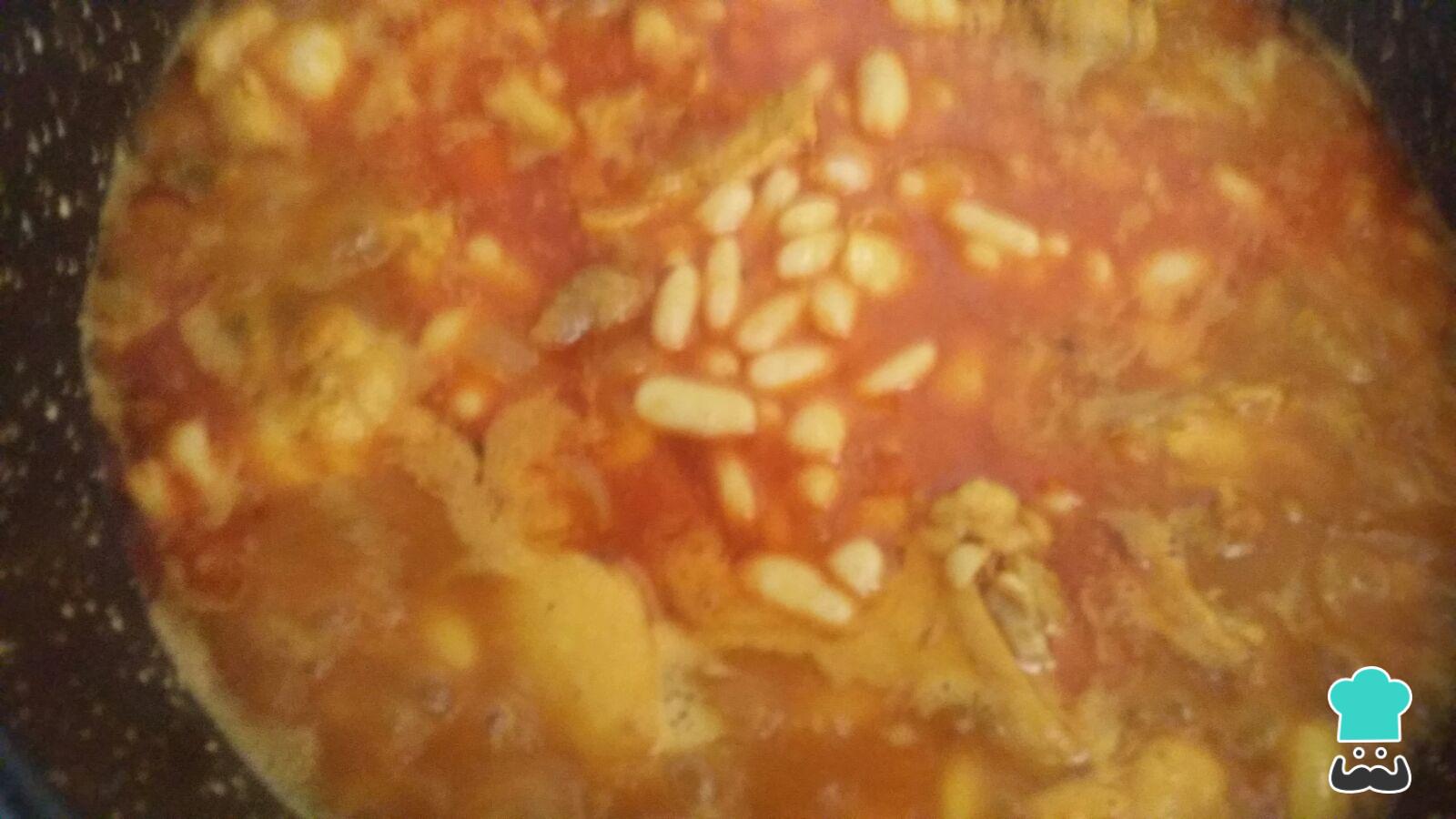 Cuando falte más o menos media hora para que las alubias estén tiernas, se escurren y se añaden a la cazuela junto al pollo y las verduras, se deja hervir.