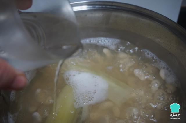 Ten las alubias en remojo la noche anterior. Al día siguiente, escurre las alubias y ponlas en una olla cubiertas de agua, pon un trozo de puerro, 4-5 dientes de ajos y la hoja de laurel.