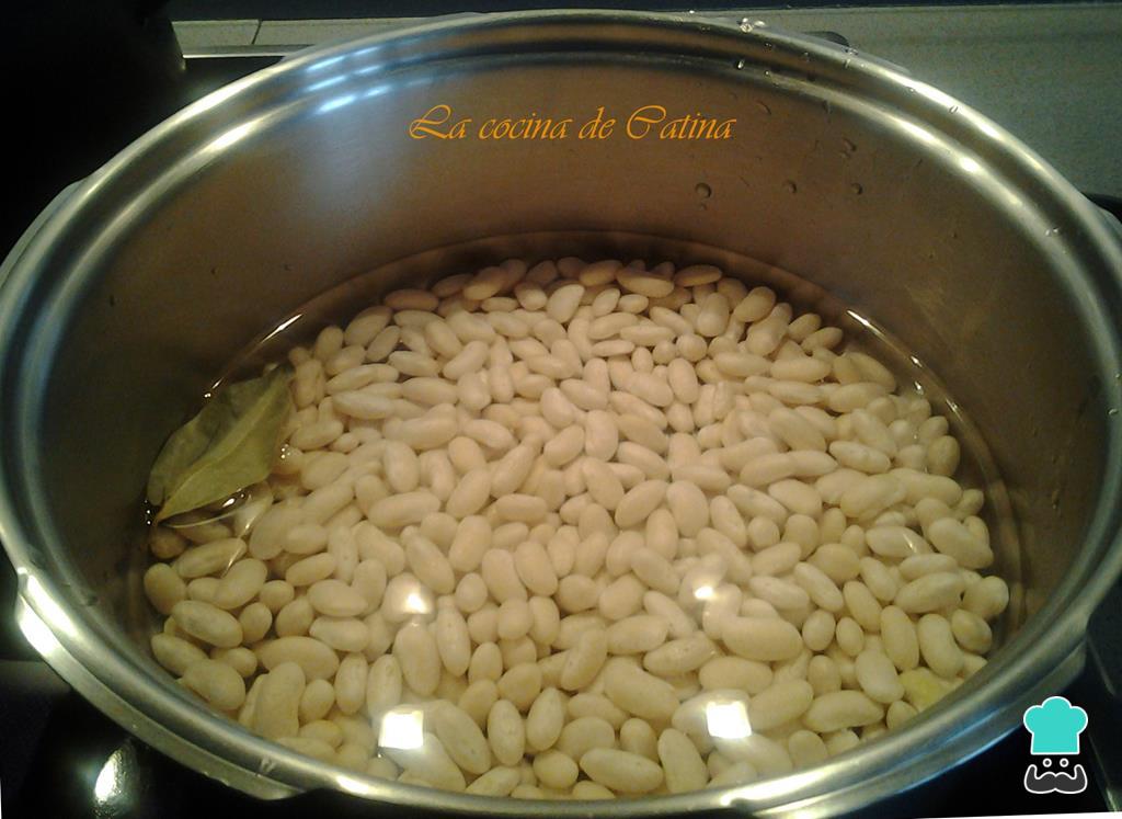 Ponemos las alubias blancas a remojo durante toda la noche, preferiblemente en un bol con agua fría. Transcurrido este tiempo escurrirlas y cocerlas con agua, un poquito de sal y una hoja de laurel durante 30 minutos aproximadamente hasta que veamos que están tiernas.