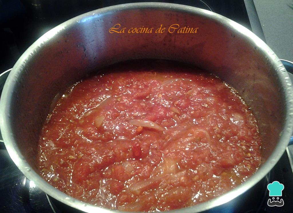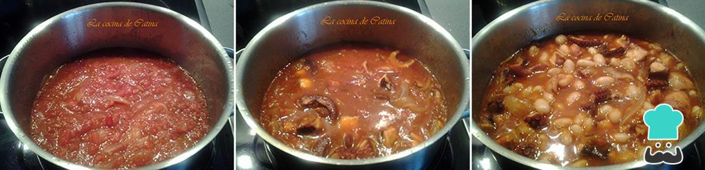 Ahora vamos a preparar el sofrito para nuestro plato de alubias con pulpo, en una cacerola con aceite freímos el ajo pelado y machacado junto con la cebolla cortada en juliana, sin que llegue a dorarse. Añadir los tomates pelados y troceados, mezclar bien y freír durante 15 minutos.