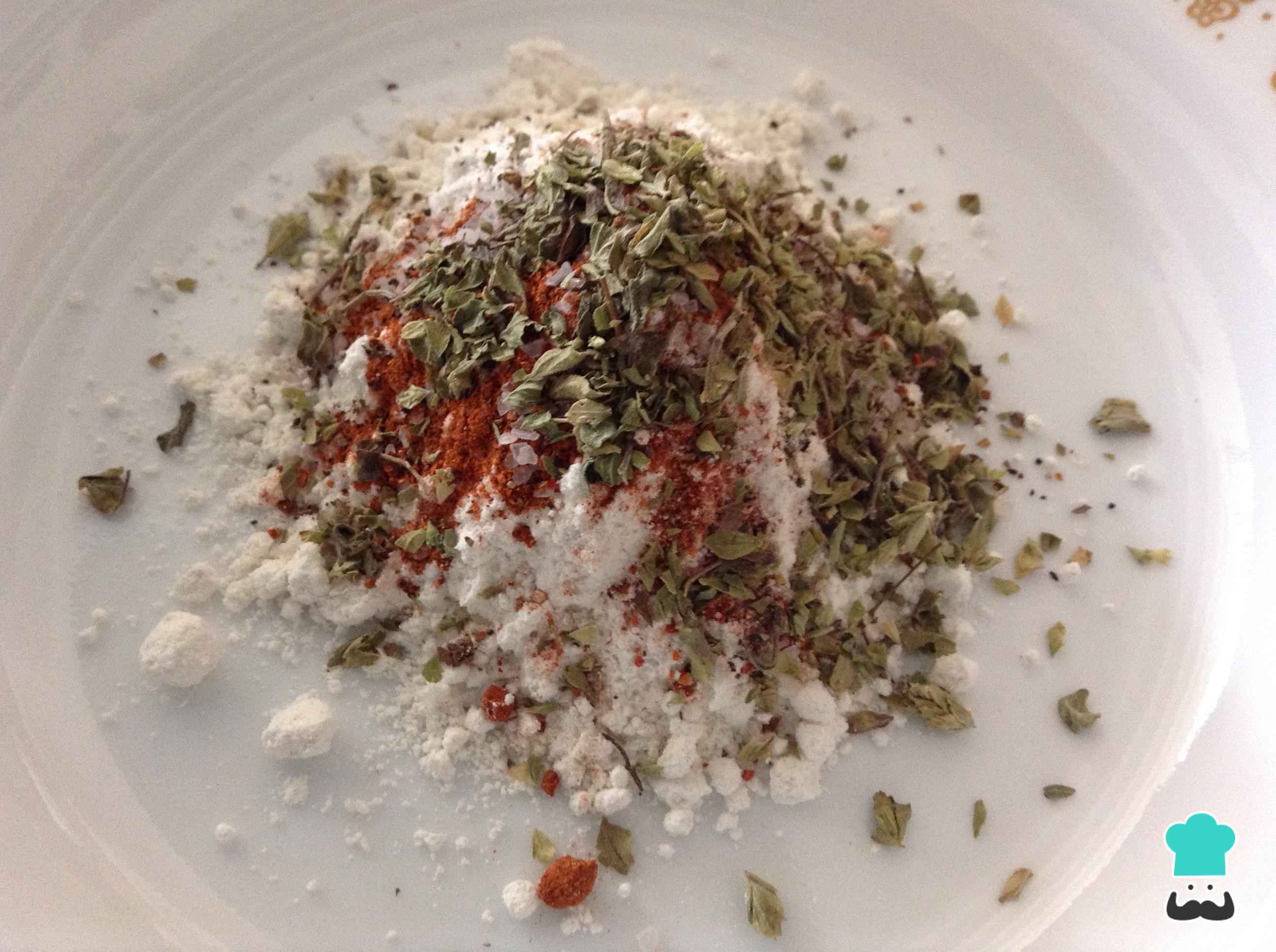 En un plato hondo adicionar la harina de trigo, sal, pimienta paprika y el toque secreto de la receta una cucharada de oregano seco.Mezclar bien todos los ingredientes.