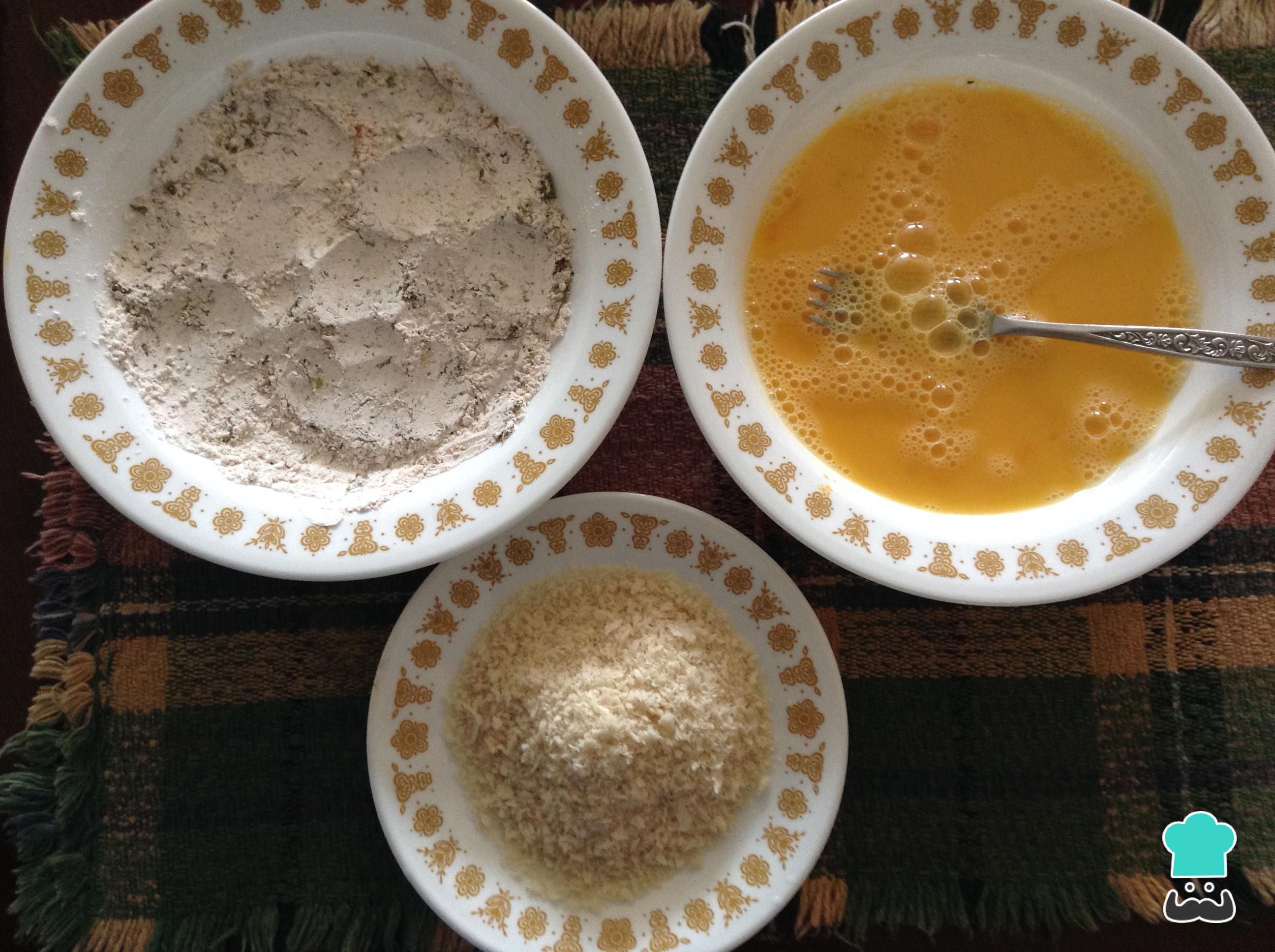 Disponer la estación para rebozar en el siguiente orden: primero la mezcla del paso dos, segundo los huevos revueltos como para tortilla y el tercero el panko.