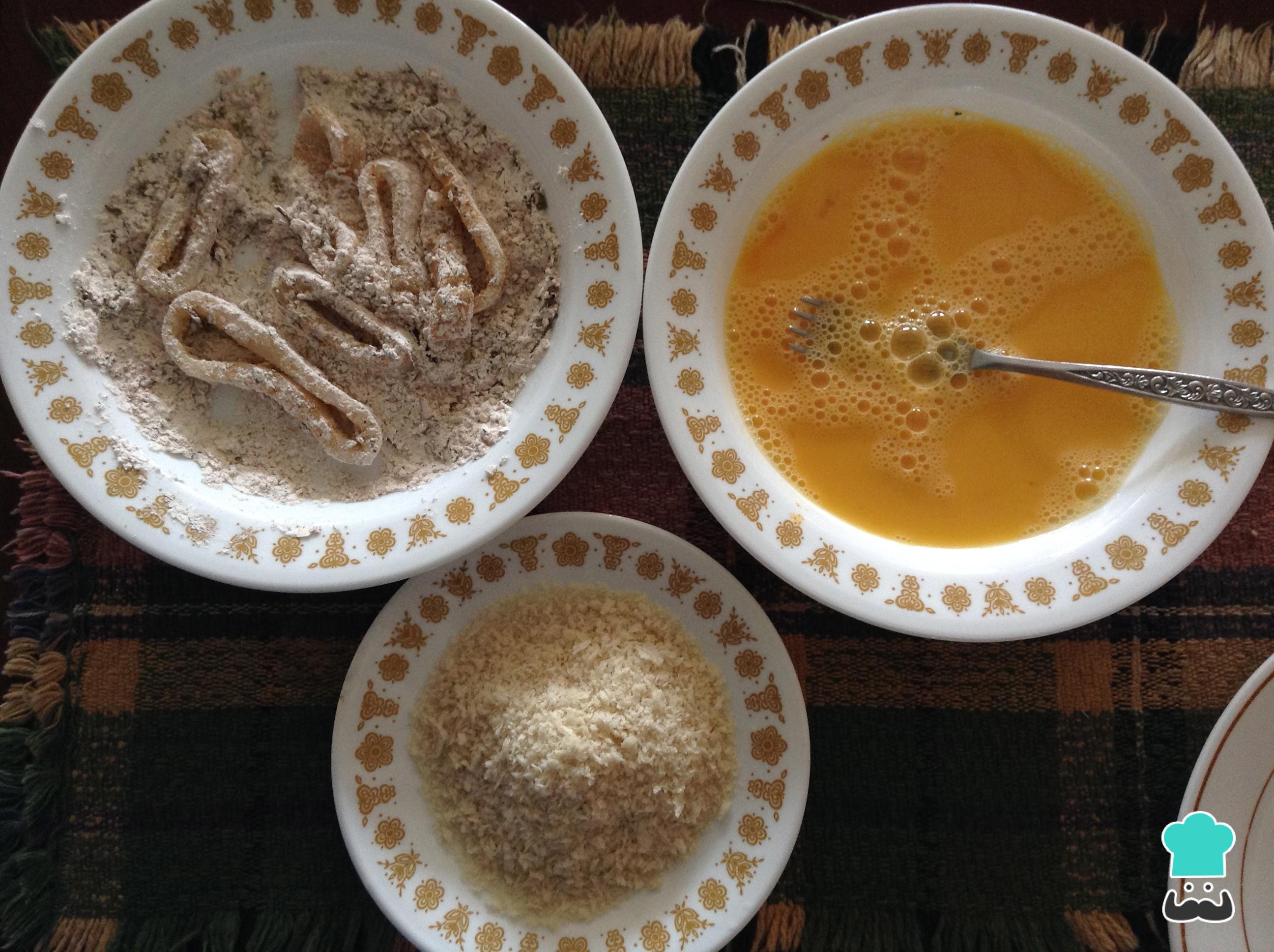 Reservar los anillos de calamar en un plato aparte, de esta manera debe quedar el apanado.