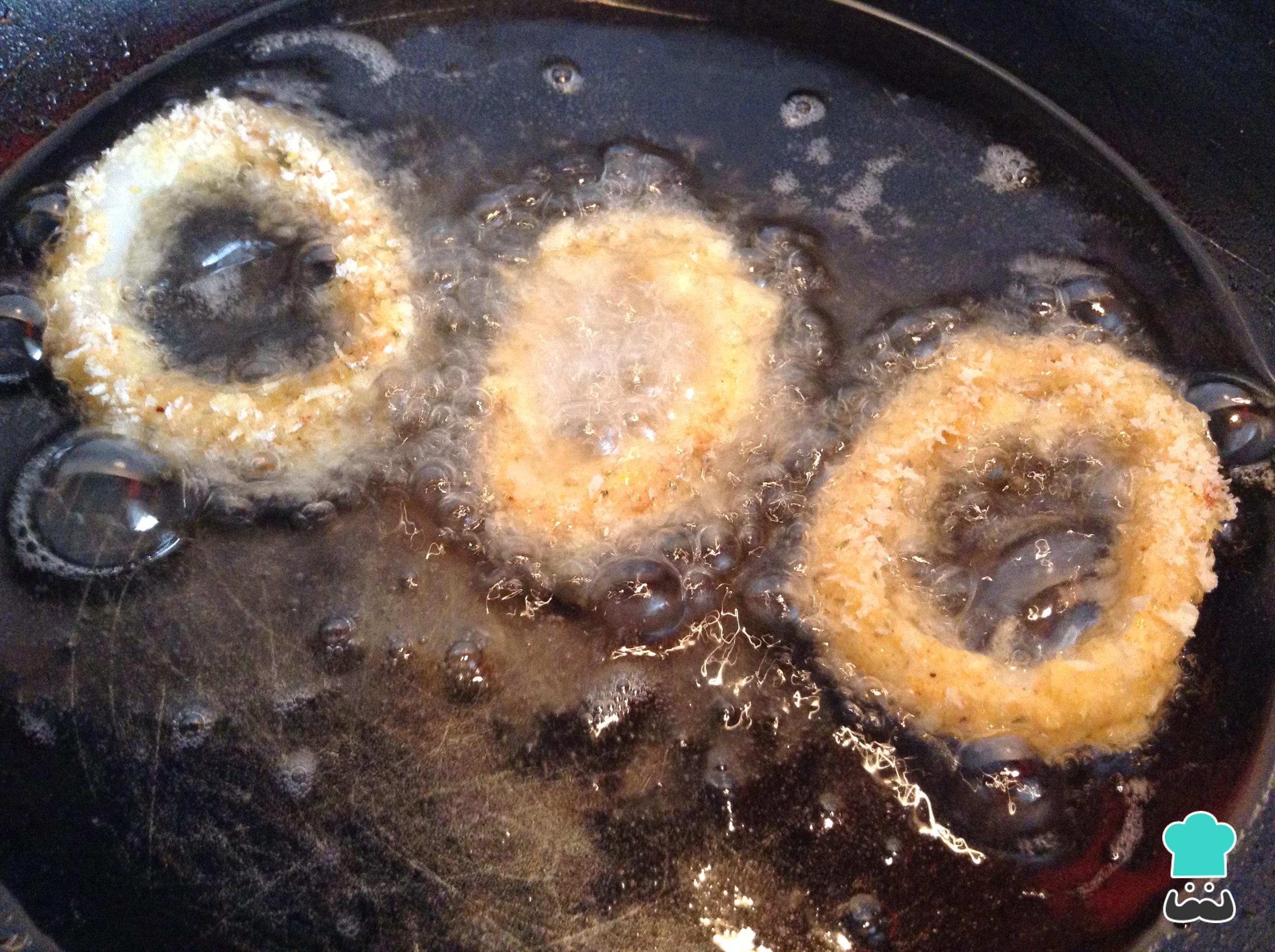 En un sartén hondo adiciona aceite de girasol abundante para freír.Una vez este caliente ( fuego medio- alto) adicionar uno por uno los anillos de calamar y dejar freír por cada lado por dos o tres minutos aproximadamente.