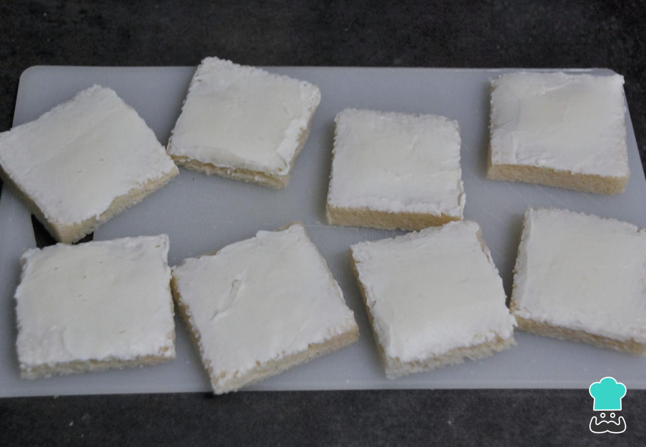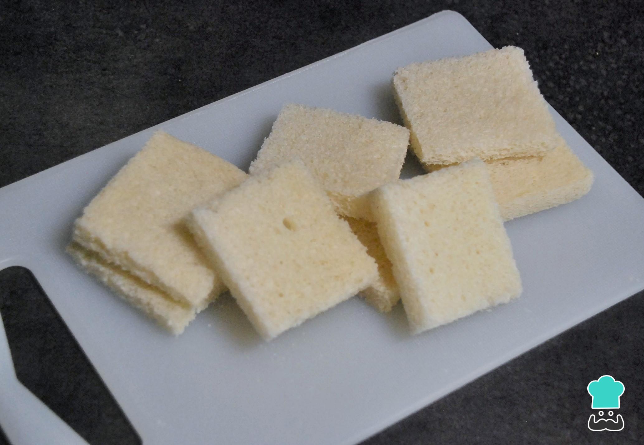 Corta en cuadros las rebanadas de pan, como se ve en la foto. Si quieres puedes tostar el pan de molde o usar pan de distintos sabores, para estos canapés de Navidad también puedes usar galletas saladas.