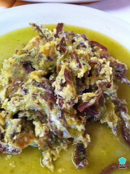 En una sartén se saltea nuevamente la cecina y desmenuzada en suficiente aceite de maíz, posteriormente se le agregan los huevos batidos, que son sazonados previamente con sal y pimienta, se revuelve todo a fin de que termine de cocer.