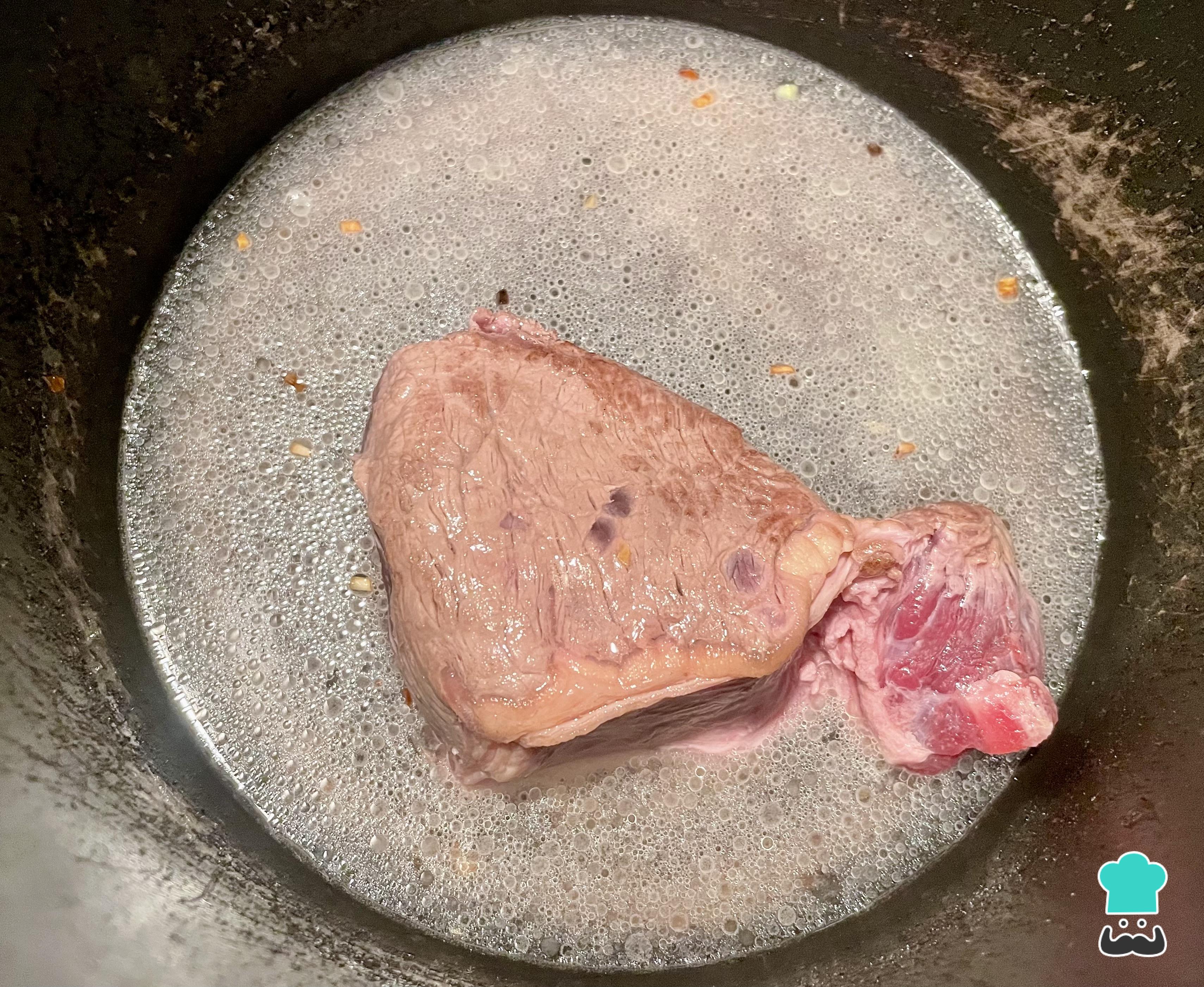 Sofríe el ajo en un poco de aceite caliente. Agrega la carne entera y cúbrela con agua.