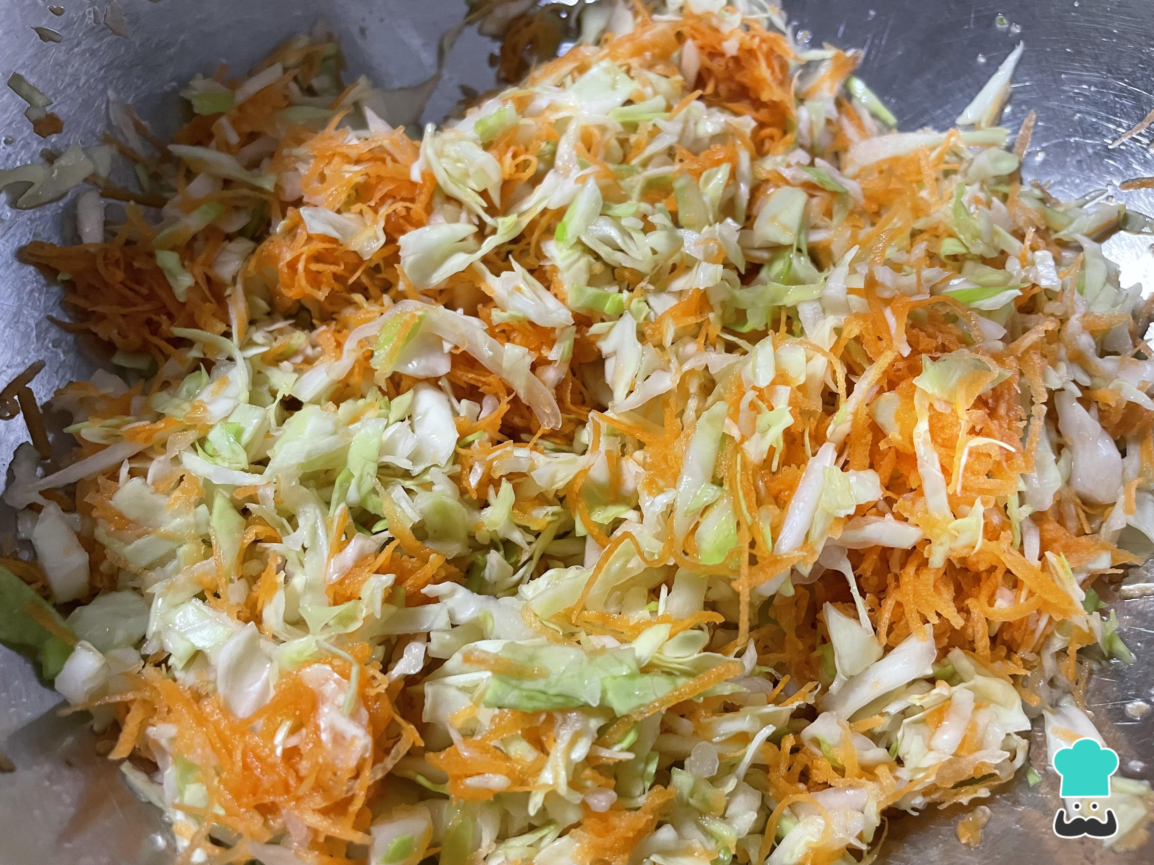 Ralla el repollo y la zanahoria. Mezcla bien en un bol. Puedes añadir una pizca de sal o unas gotas de limón para realzar el sabor.