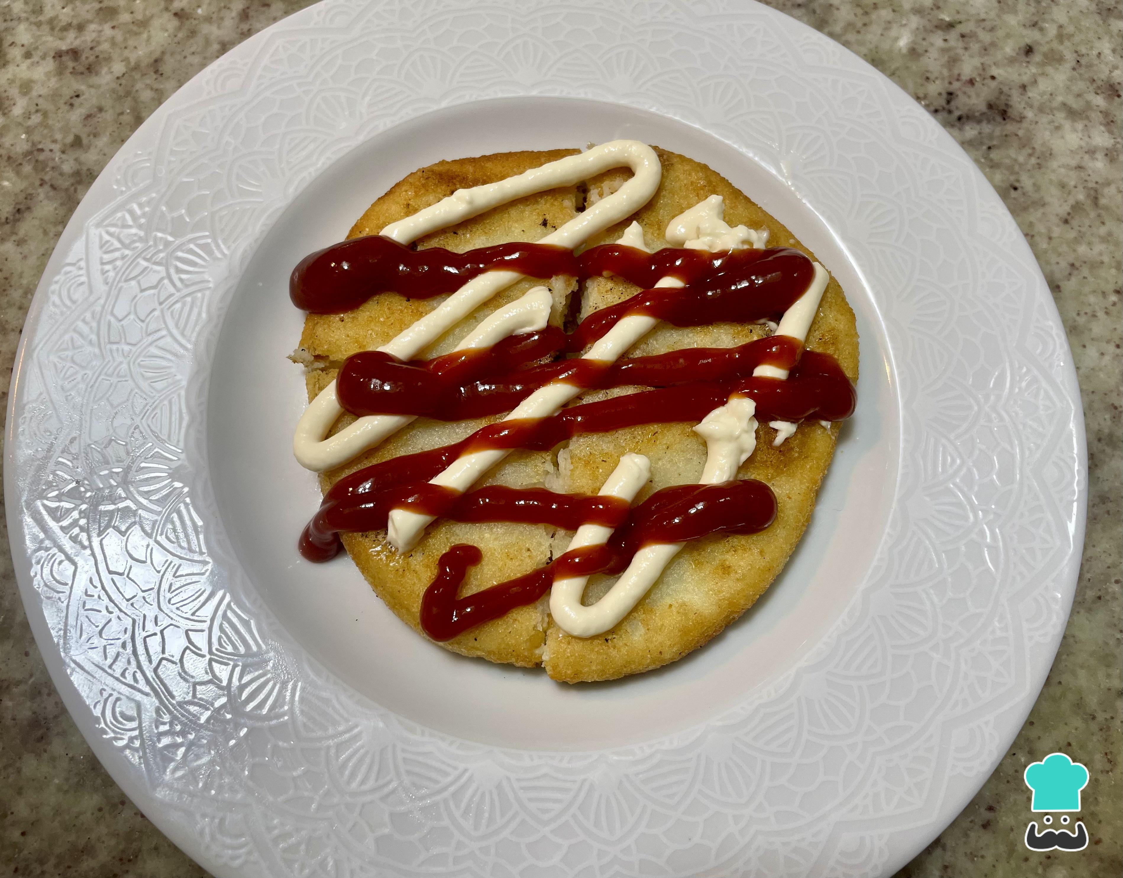 Corta la arepa en 4 secciones sin separar del todo, como una pizza. Unta mayonesa y ketchup.