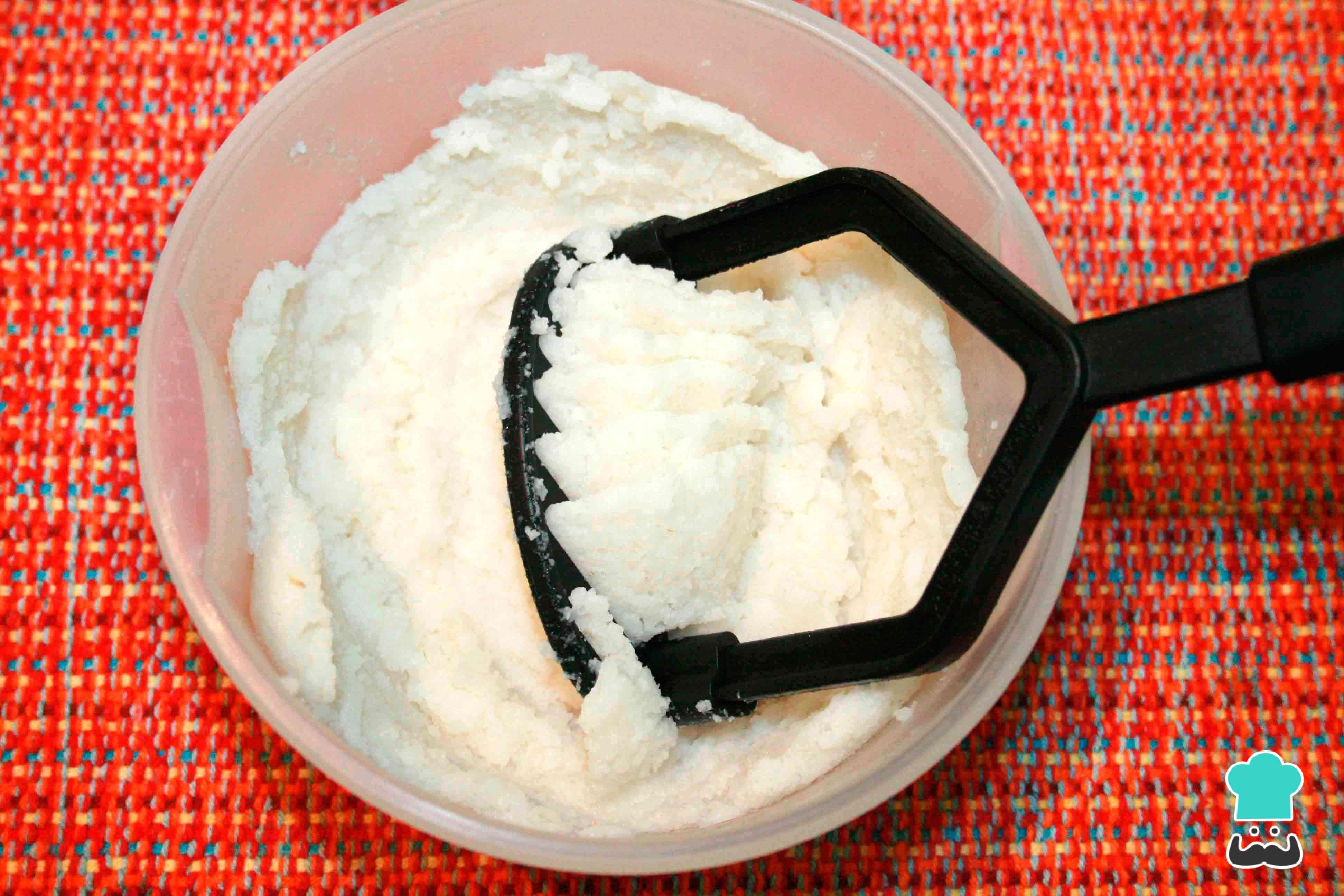Tritura muy bien el arroz, hasta producir una masa de textura pareja. Trata de aplastar muy bien todos lo granos de arroz para que las arepas sin harina posean mejor textura.