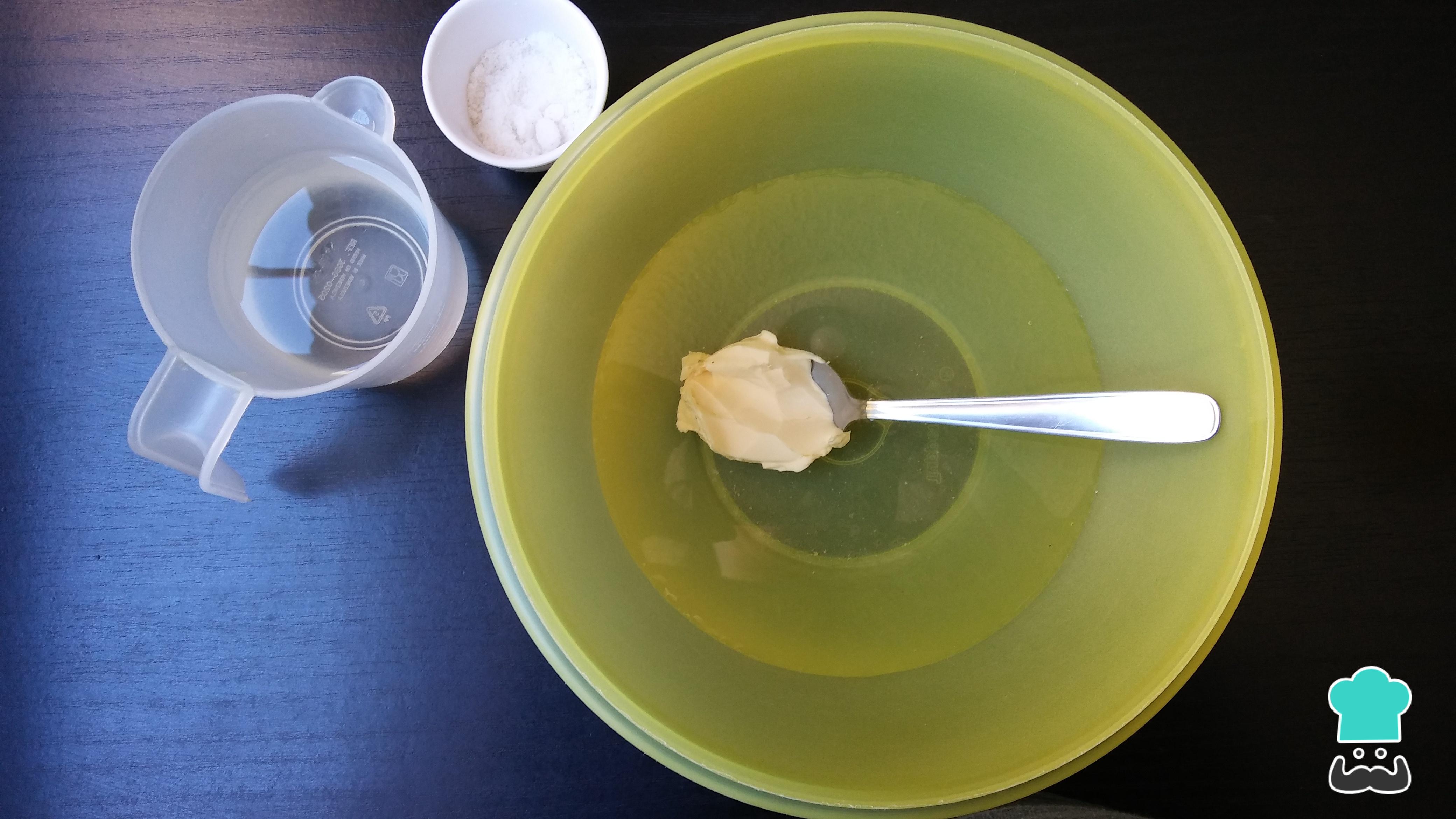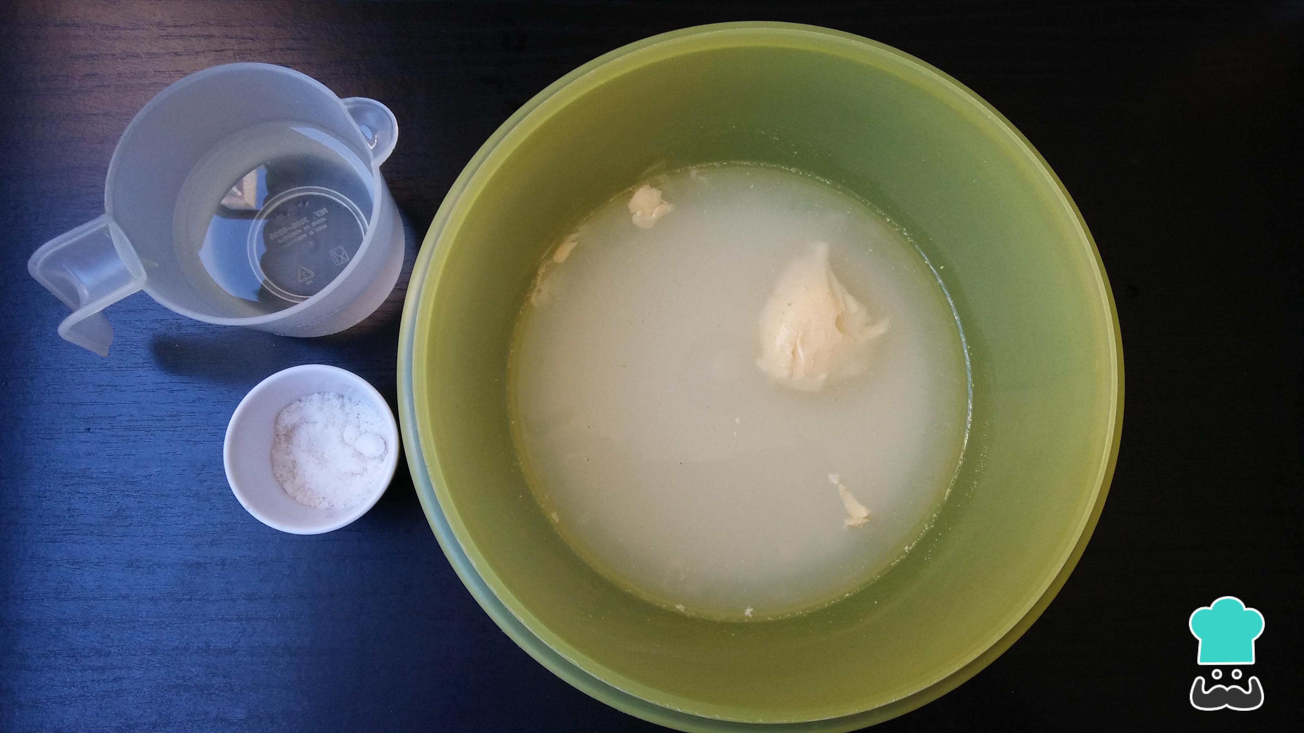 Agrega en un bol el agua, la mantequilla y la sal. A continuación, diluye la sal y la mantequilla añadiendo la mano y revolviendo con los dedos. Pasarás al siguiente paso cuando se disuelva por completo la sal.
