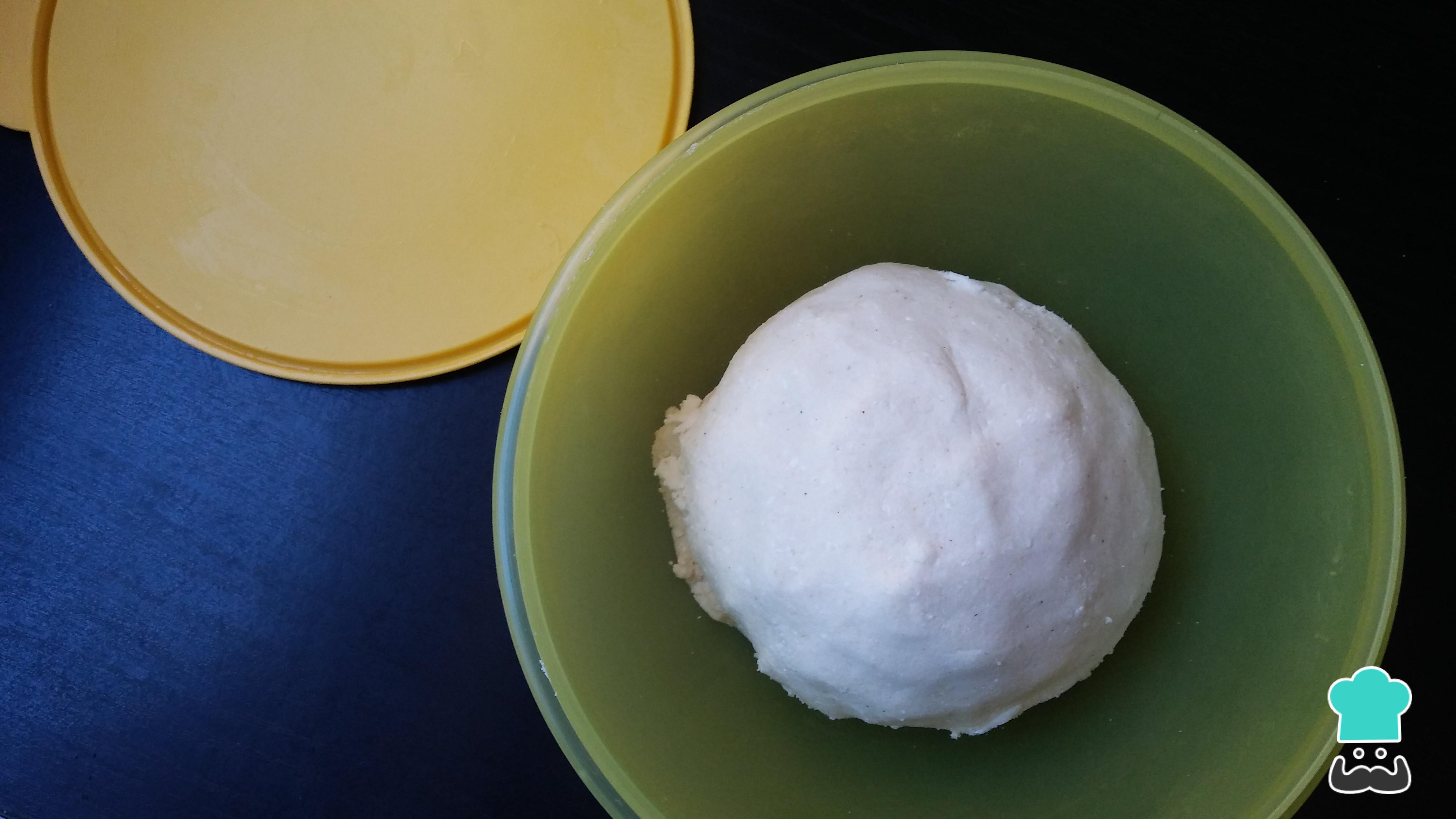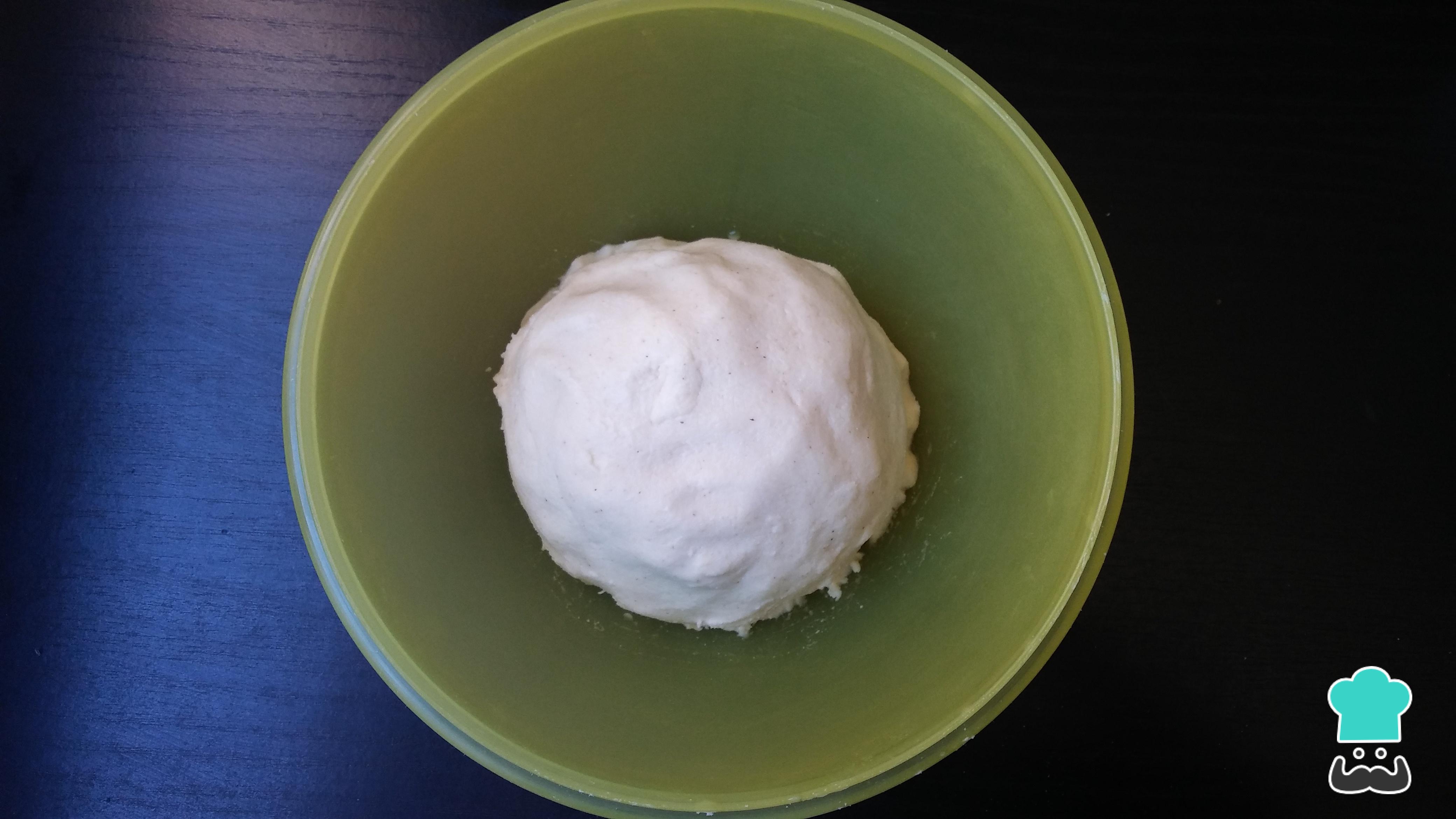 Deja reposar la masa de 3-5 minutos. A continuación, coloca encima del bol un paño de cocina levemente humedecido o la tapa del recipiente si tiene una. También puedes guardar la bola de masa dentro de una bolsa plástica o papel film.