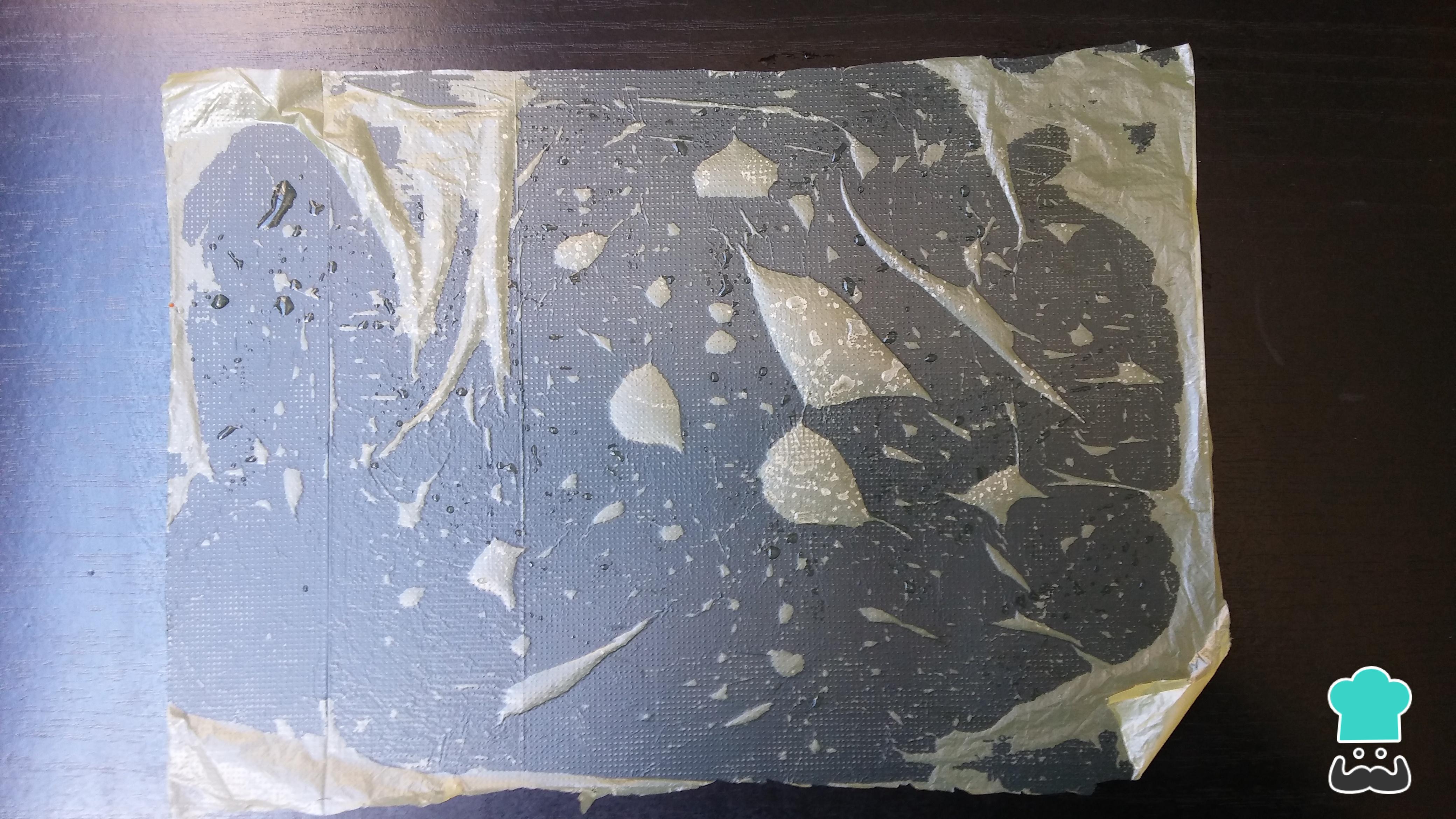 Hay varias maneras de darle forma final a las arepas, pero la que te mostraremos a continuación es la más fácil. Recorta un cuadrado a partir de una bolsa plástica. Antes de colocarla sobre el espacio de trabajo, humedece la mesa para que el plástico se adhiera y no se mueva durante el proceso de amasado. Cuando hayas puesto el plástico y quede fijo, también humedece su superficie.