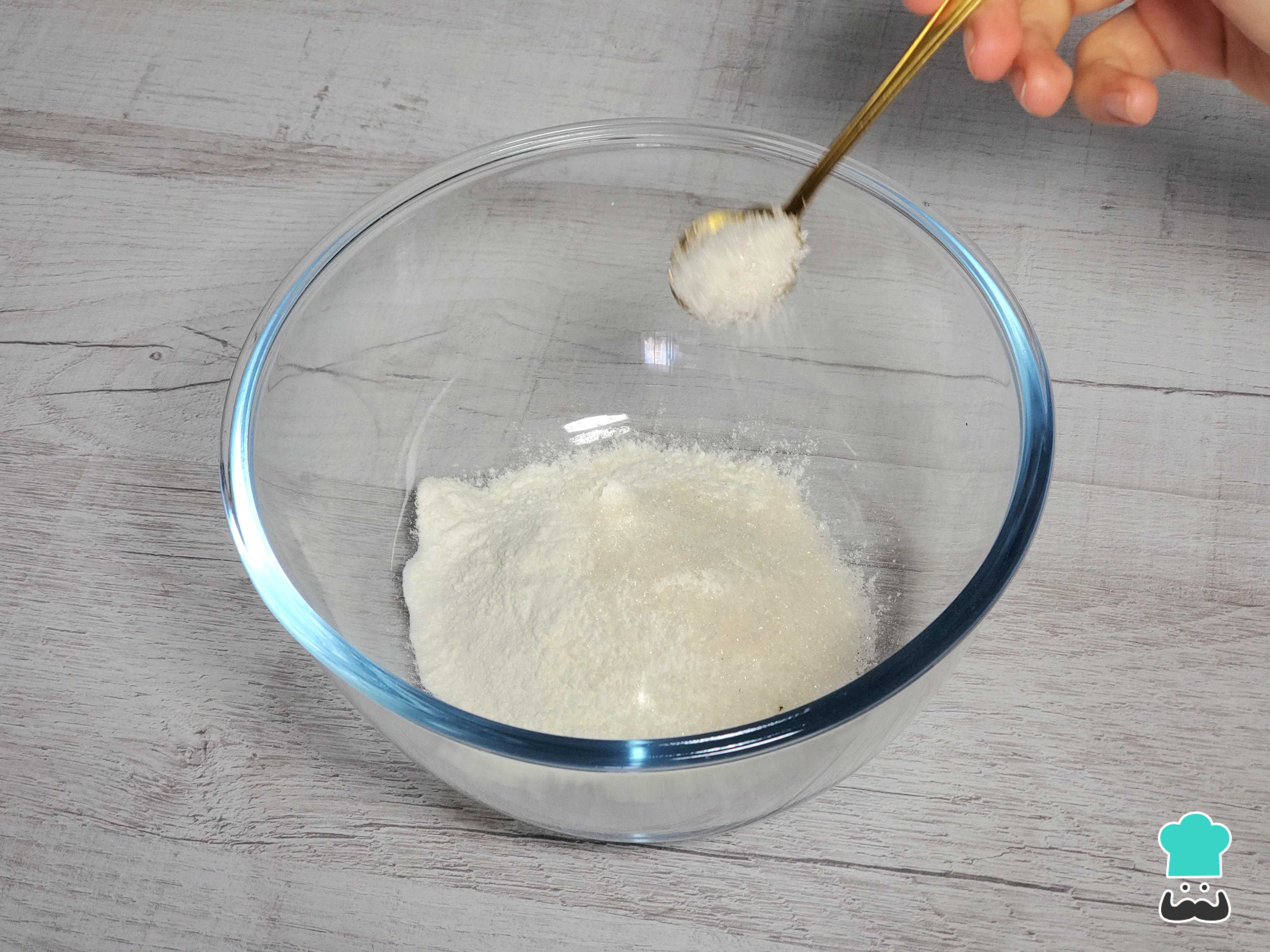 Para comenzar a preparar las arepas colombianas, coloca en un bowl la harina, el azúcar y una pizca de sal. Mezcla bien.