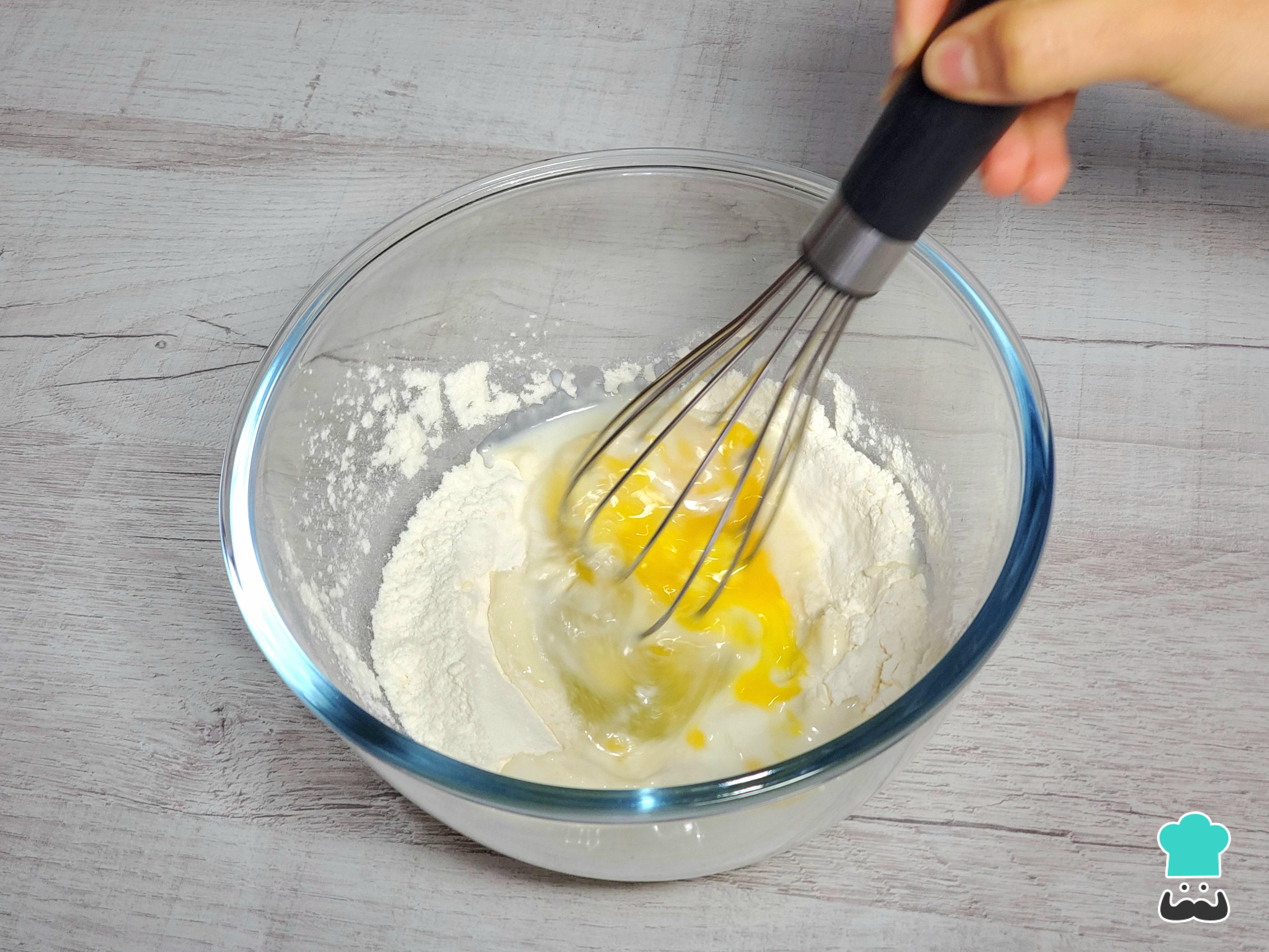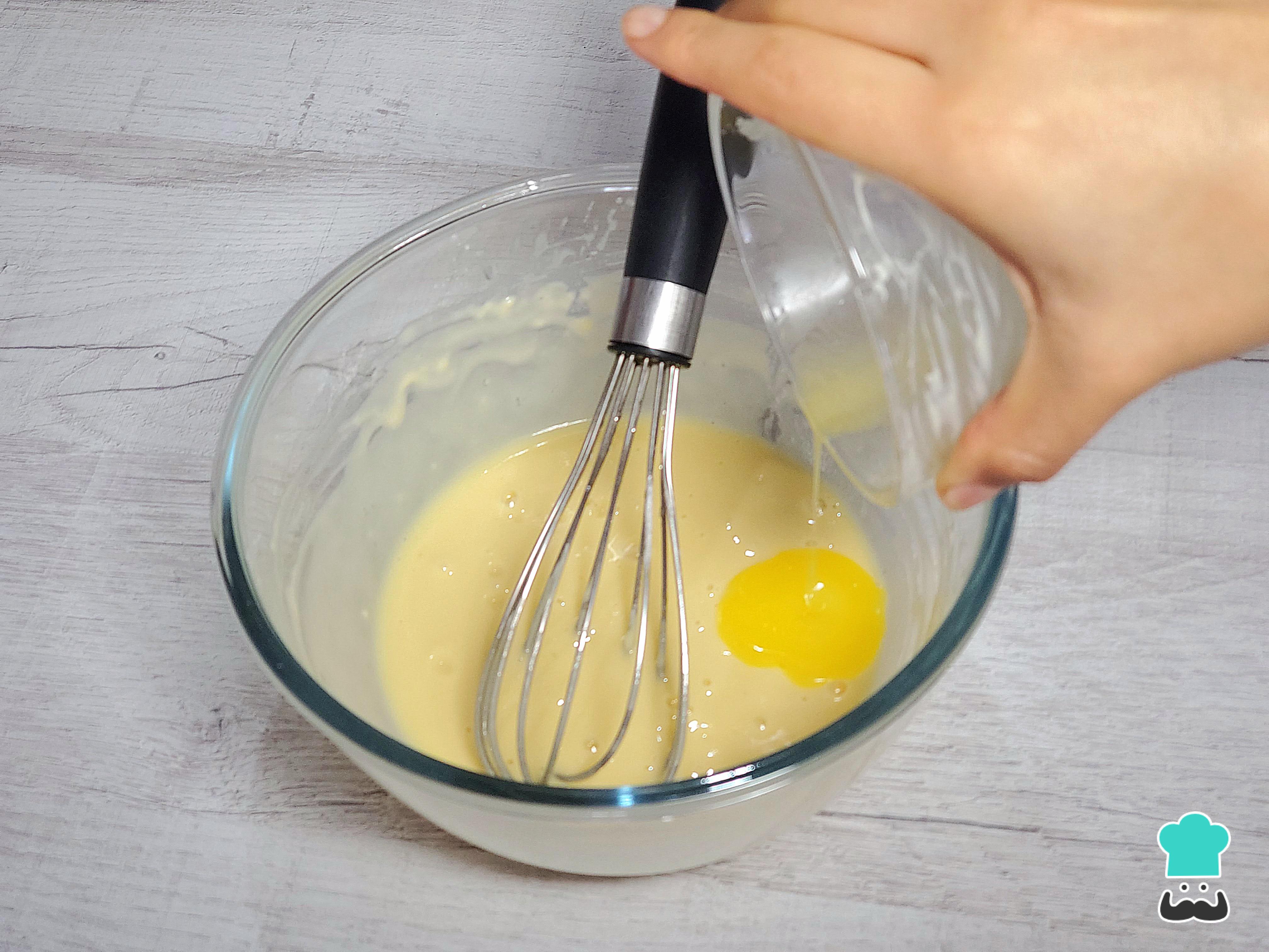 Vierte los ingredientes líquidos: la leche y el huevo. Bate con un batidor de globo, moviendo desde el centro hacia afuera, hasta que la mezcla esté uniforme y sin grumos.