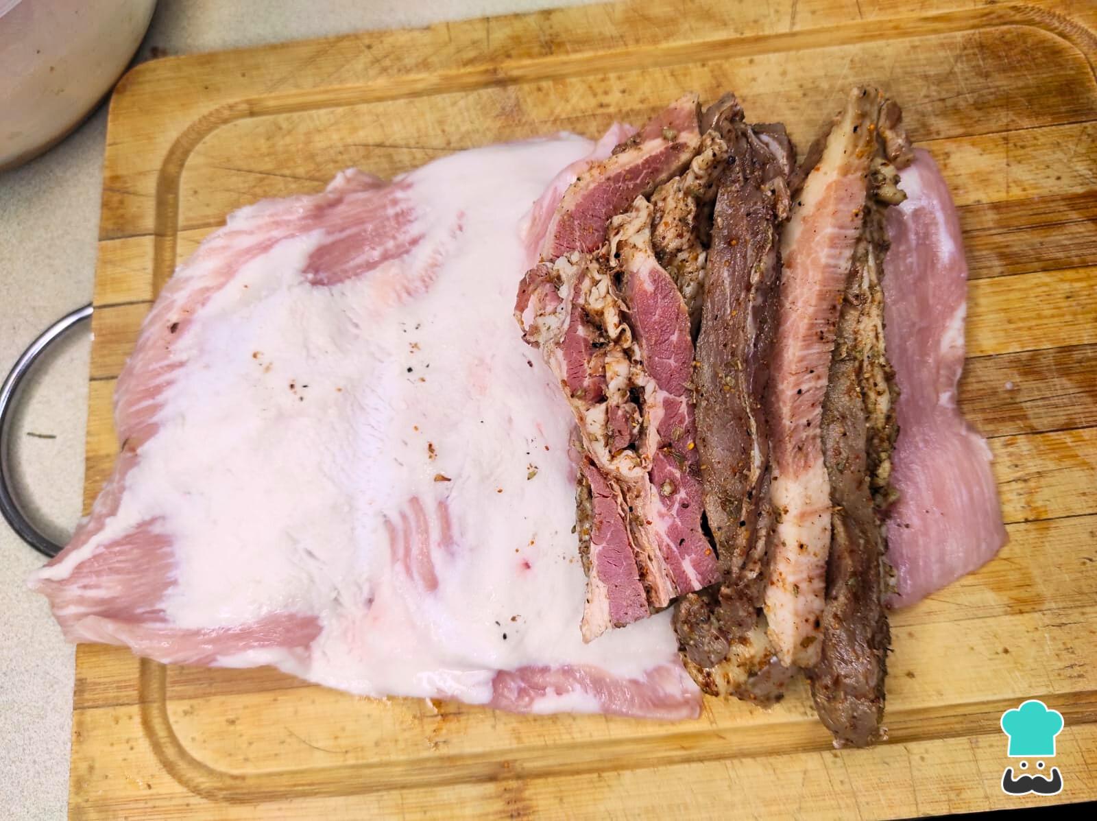 Corta la pulpa de cerdo y el tocino en tiras de 1.5 a 2 centímetros de ancho. Junta todos los ingredientes del adobo e incorpora con la pulpa de cerdo y tocino, mezcla y deja reposar por al menos 4 horas o idealmente toda la noche.