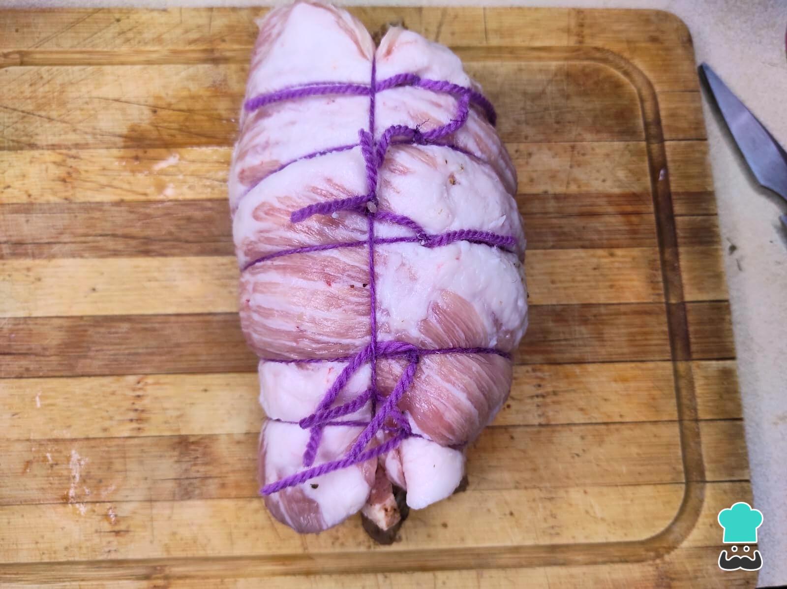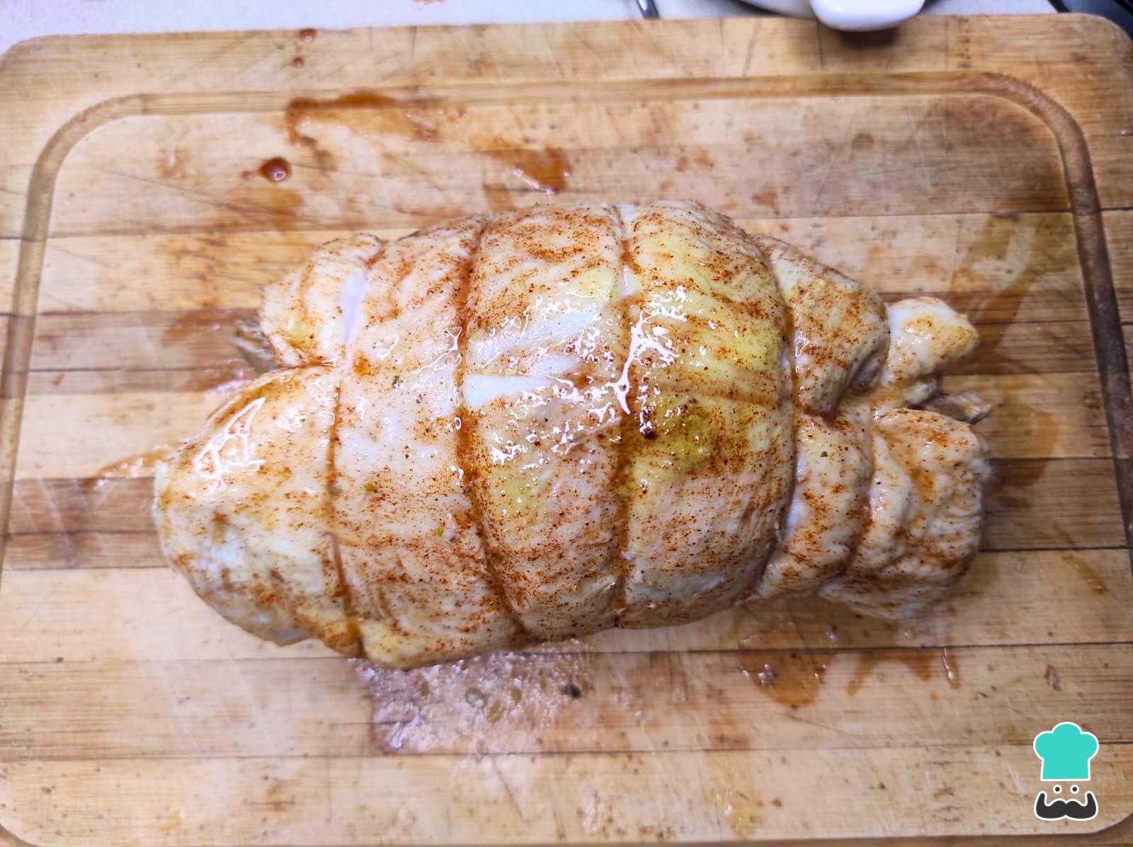 Elabora una mezcla con el aceite y el ají de color. Una vez frío, retira el arrollado del caldo, corta las amarras y pincela con esta mezcla en toda la superficie.