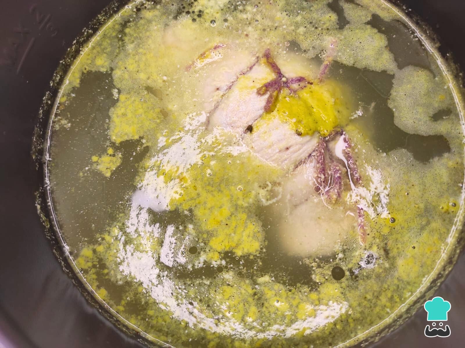 Pon el arrollado en una olla y tapa por completo con el caldo. Cocina a fuego medio alto hasta que hierva el caldo, luego baja al mínimo y cocina tapado por 2 horas o hasta que el arrollado esté blando. Apaga el fuego y deja enfriar en el caldo.