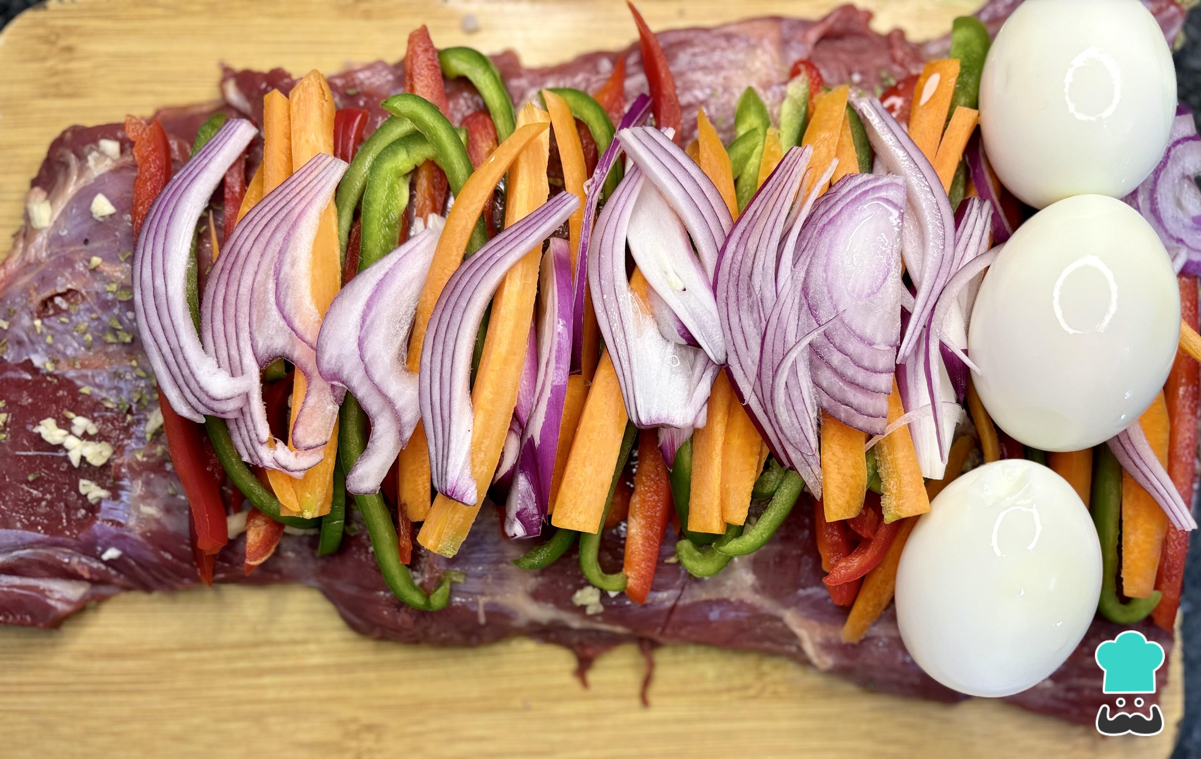 Limpia la malaya de los excesos de grasa. Luego, aliña con sal, ajo molido, pimienta molida, y orégano todo a gusto. Forma un cuadrado con la malaya. Rellena el cuadrado de malaya con las tiras de zanahoria, las tiras de pimentón y la cebolla. Añade los huevos duros sobre las verduras.