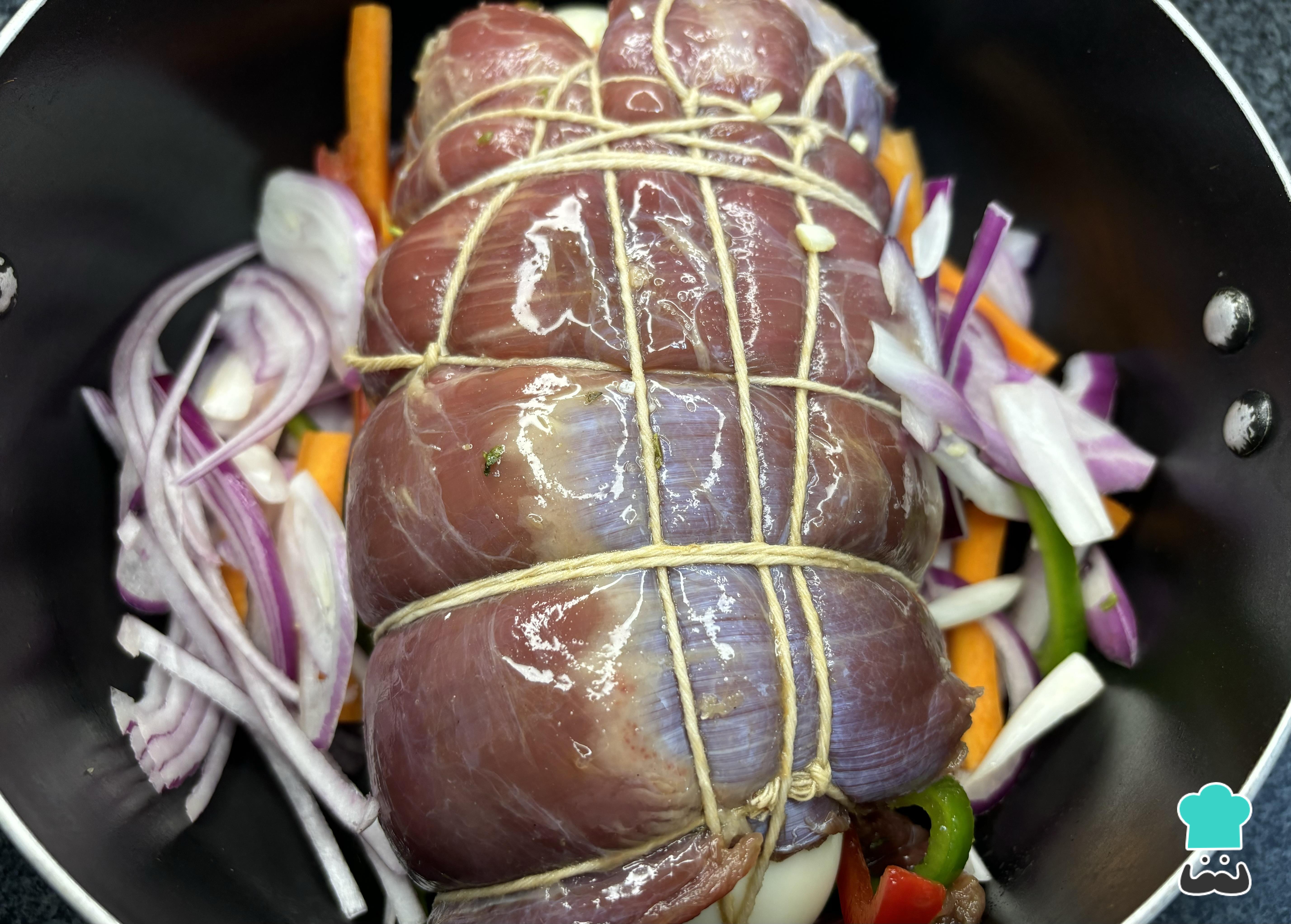 Usa hilo de cocina o malla de carnicero para atar el arrollado de manera que mantenga su forma durante la cocción. Asegúrate de atar bien ambos extremos y el centro. En una olla grande, agrega agua suficiente para cubrir la carne, lleva a ebullición y reduce el fuego a medio-bajo. Tapa la olla y cocina por aproximadamente 1 hora, o hasta que la carne esté tierna.