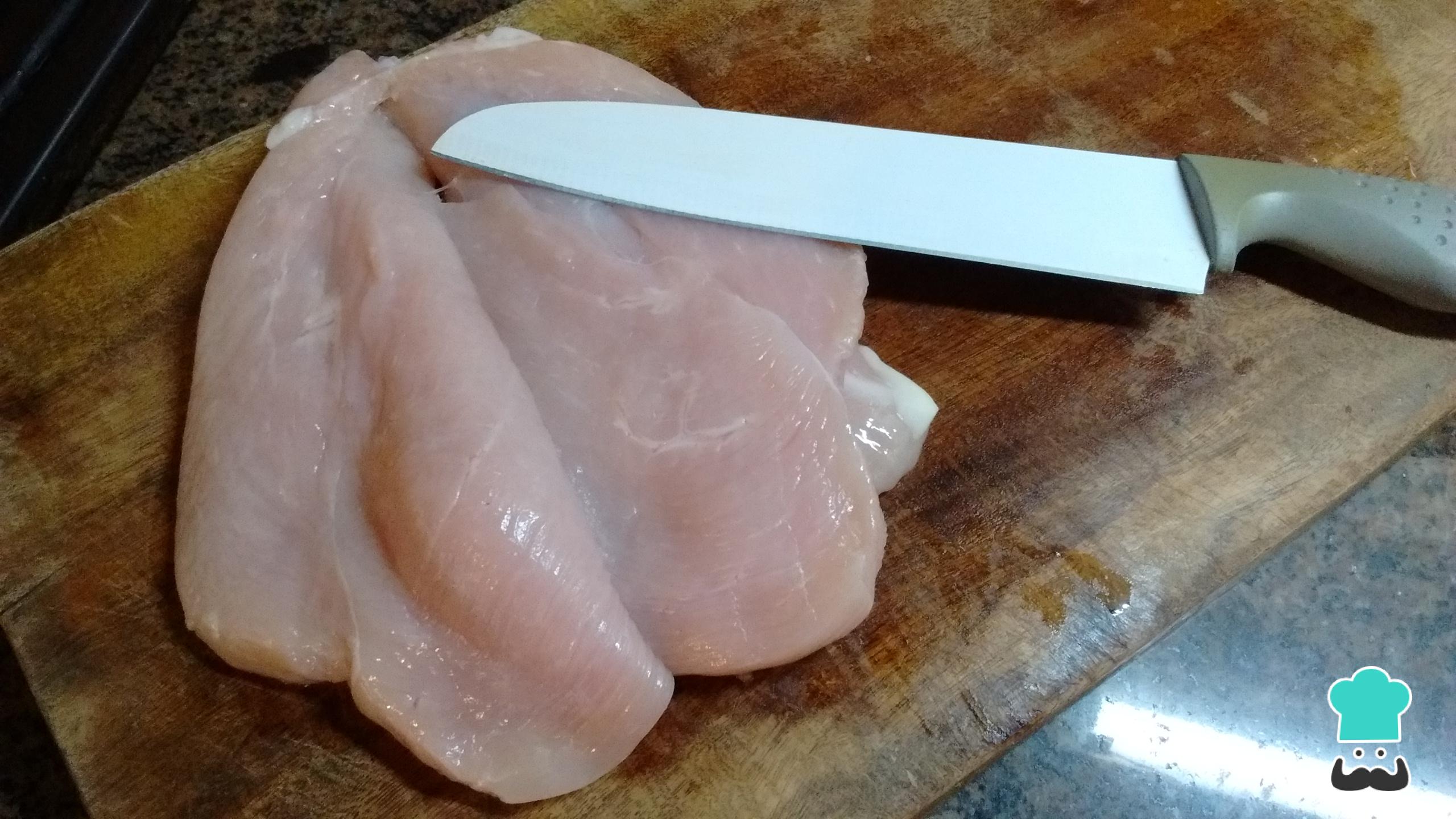 Lo primero que debes hacer es limpiar la suprema de pollo, retirando cualquier resto de grasa o cartílagos. A continuación, con un cuchillo bien afilado debes abrirlas por el medio. Al hacer esto, obtendrás dos filetes que volverás a cortar a la mitad obteniendo más filetes de suprema de pollo. Una vez hayas cortado la suprema de pollo, debes reserva en la heladera hasta que las utilicemos.