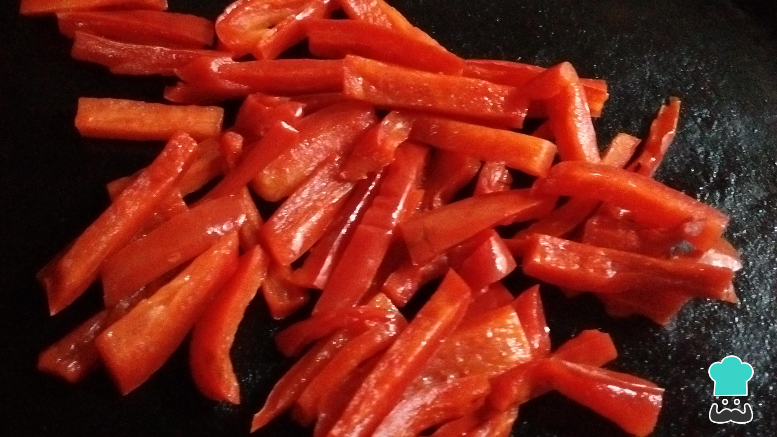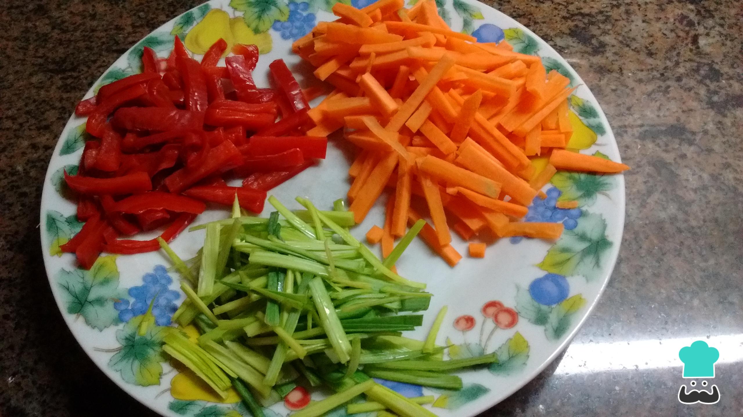 Seguidamente, debes cortar la zanahoria, el pimiento rojo y las hojas tiernas del puerro en finas tiras.