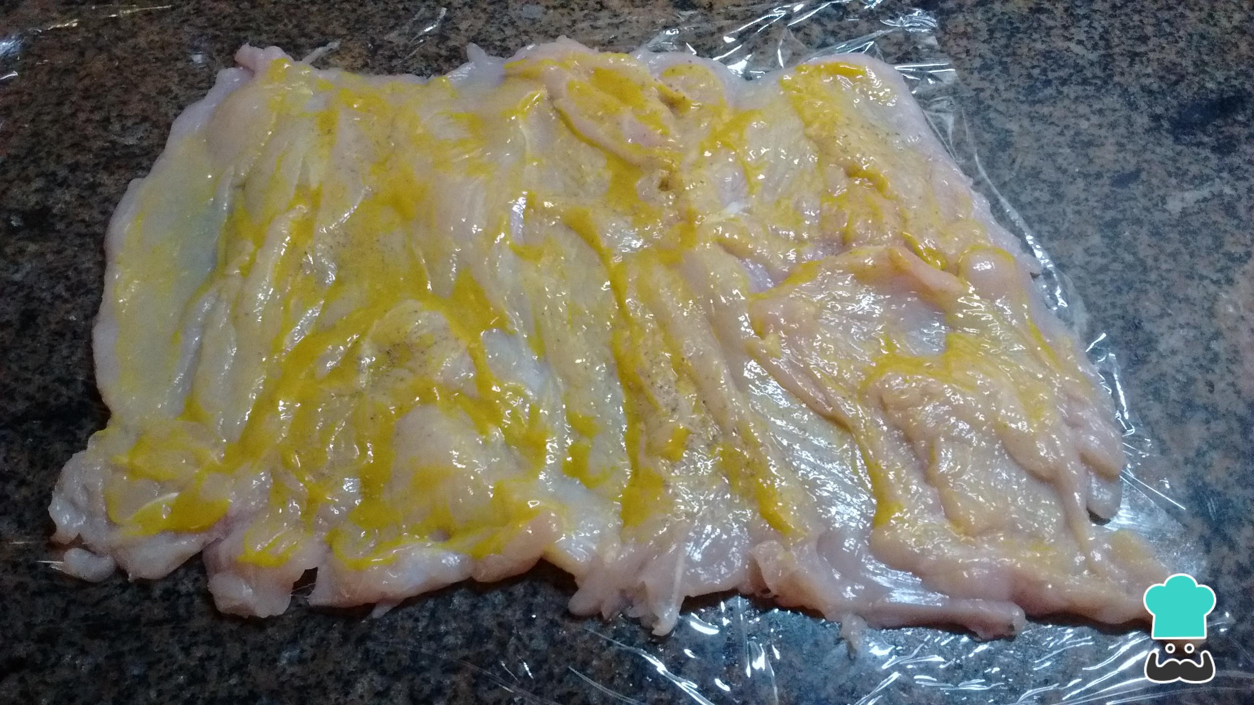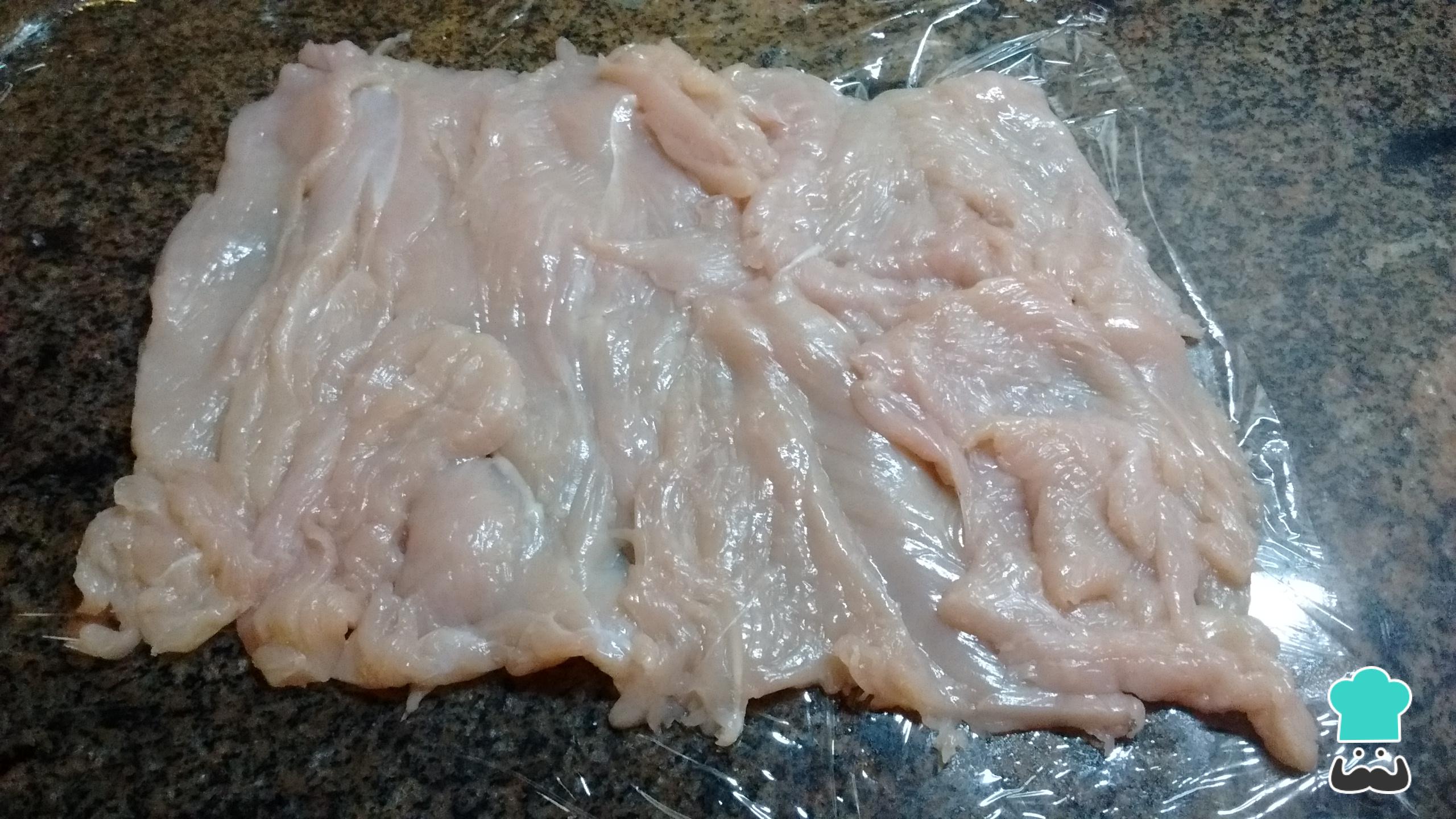 Ahora es momento de extender sobre la mesada un papel film. Una vez hecho esto, debes acomodar encima los filetes de suprema de pollo que anteriormente reservaste. Debes colocarlo formando un cuadrado o rectángulo y enchipando un poco los filetes para que luego se adhieran con el colágeno típico de la carne del pollo.