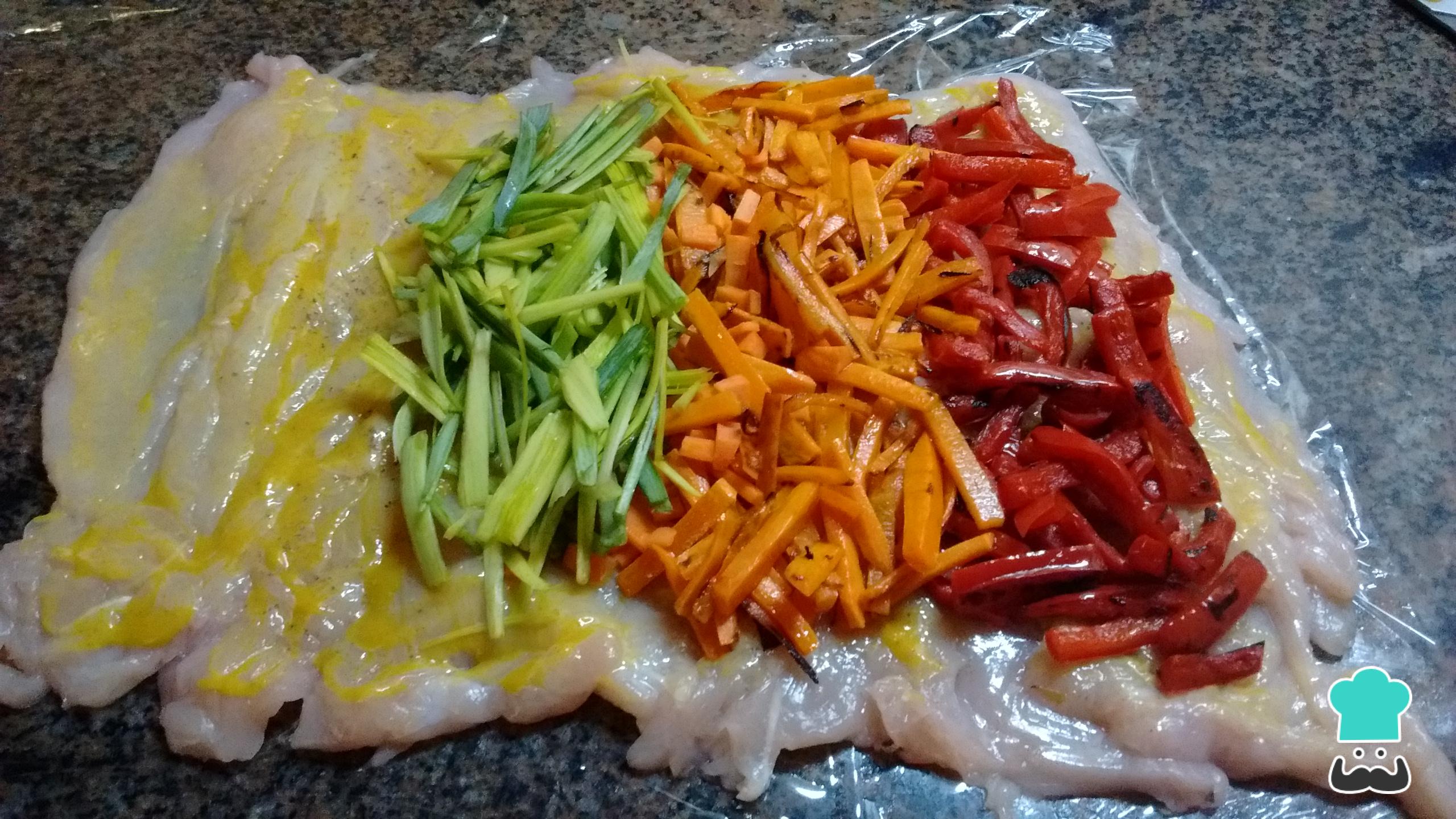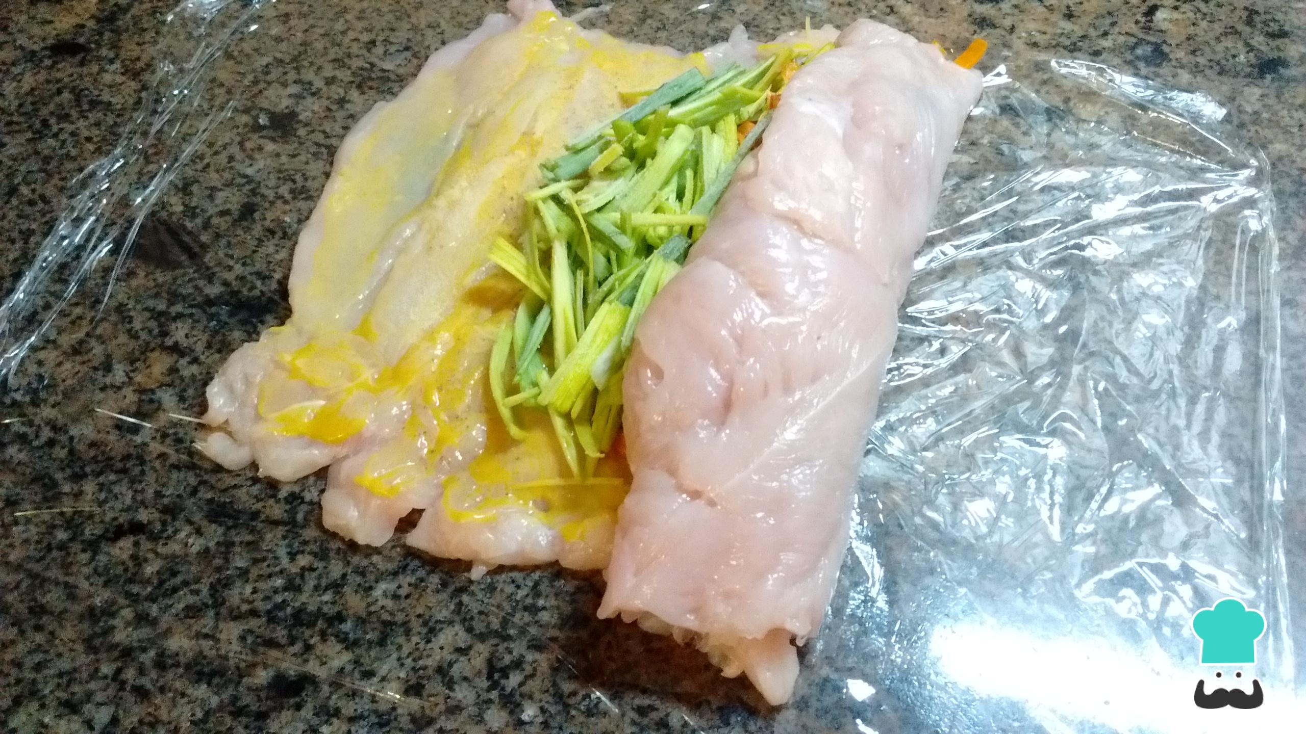Posteriormente, distribuye las verduras en filas y espolvorea con la gelatina sin sabor. Esto ayudará a que no se desarme el matambre de pollo.