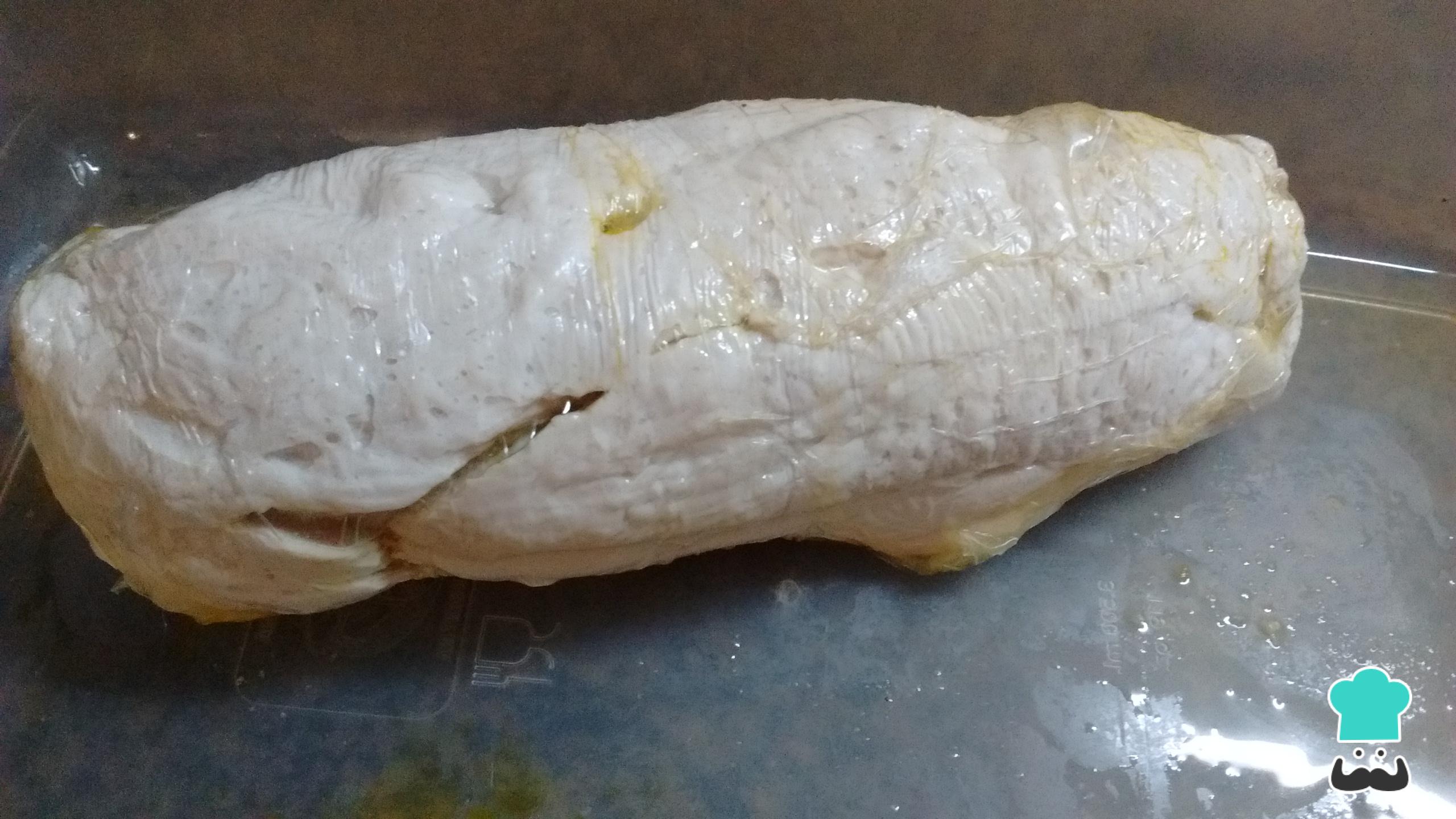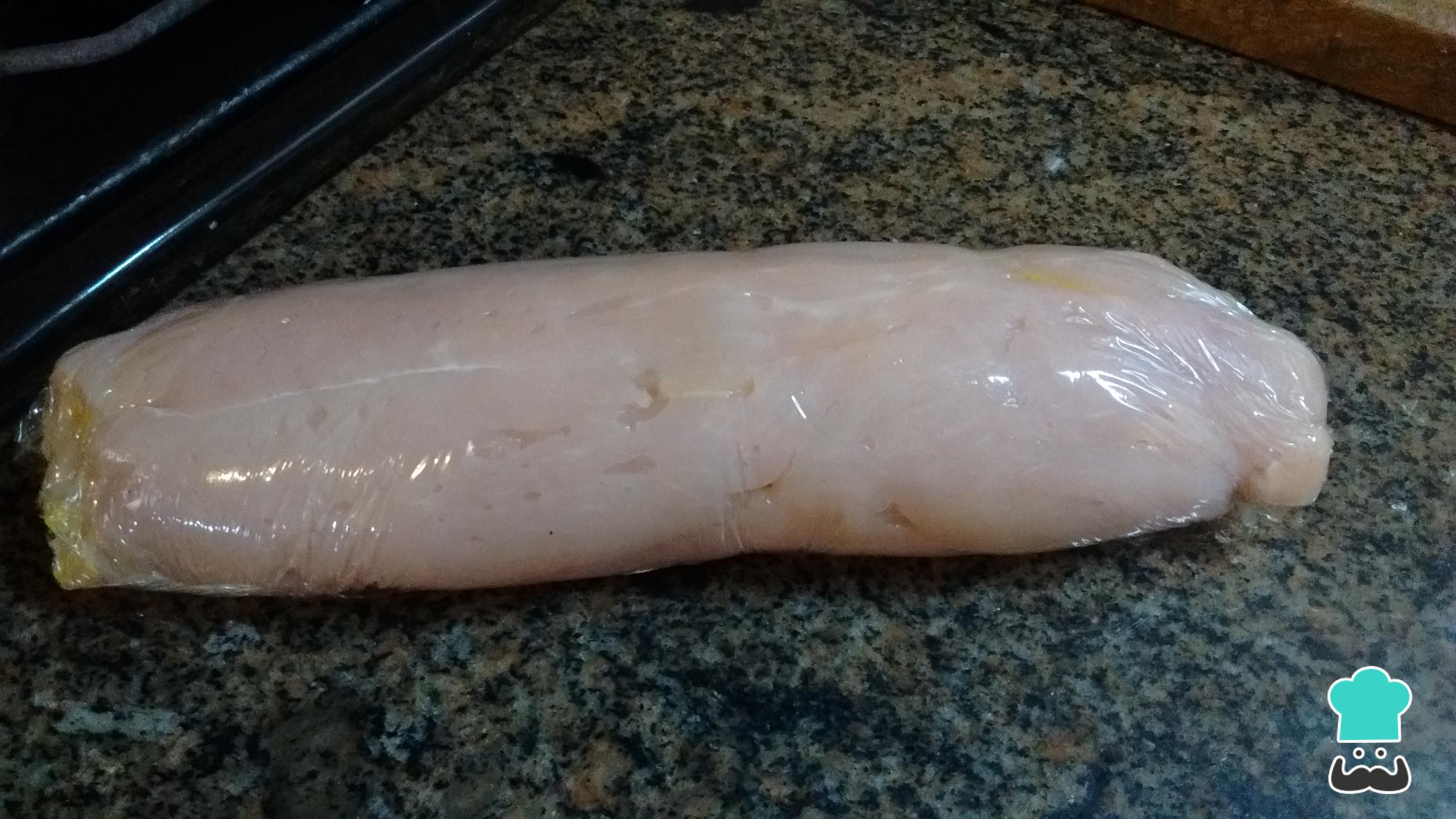 Ahora, con la ayuda del film, enrolla el pollo presionando para que quede bien firme.