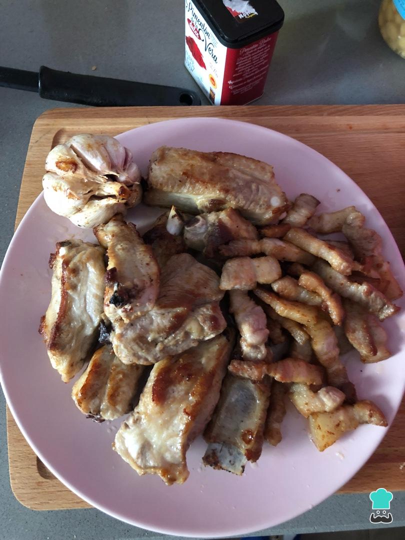 Primero se sofríe toda la carne en una sartén por separado junto con la cabeza de ajos y se deja por separado en un plato.