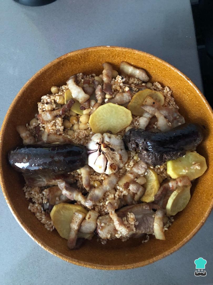 Después se coloca la carne junto con la patata y los ajos en una cazuela de barro y se le añade el sofrito de arroz.