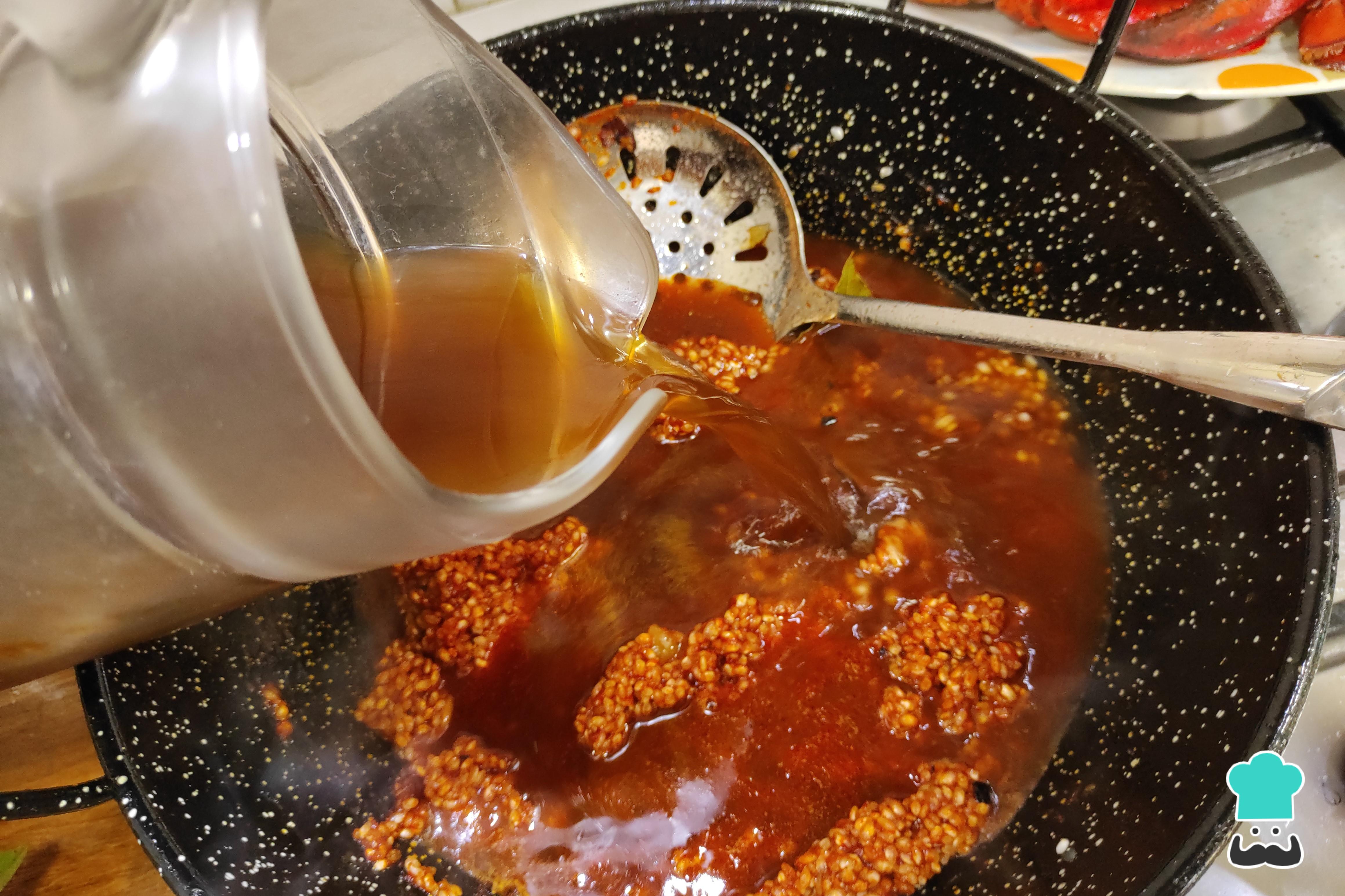 Cuando haya pasado este tiempo, debes verter el caldo o fumet para el arroz con bogavante. Para esta receta de arroz caldoso de bogavante, puedes utilizar caldo de cocer hecho a base de cáscaras y cabezas de gamba o, simplemente, el caldo típico que hay en las neveras de los supermercados.