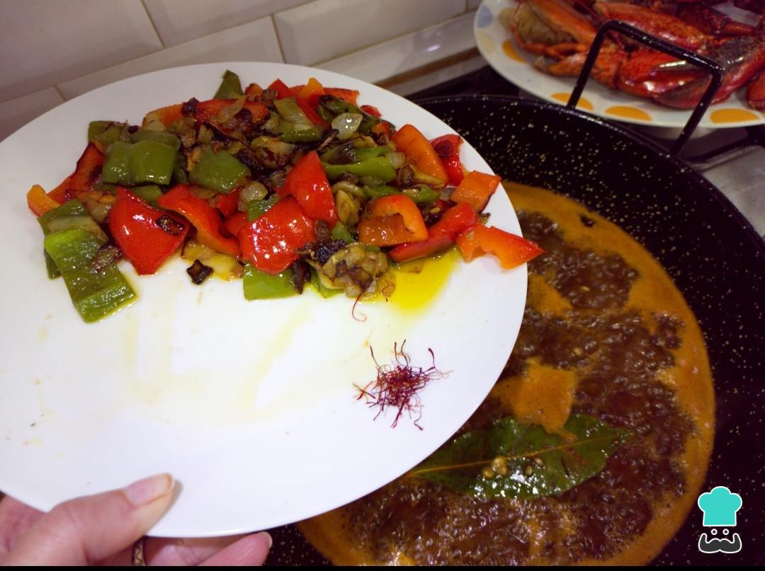 A continuación, deja que el caldo entre en ebullición. Cuando hayan pasado dos minutos desde que el caldo está hirviendo, debes añadir el sofrito hecho a base de pimientos, cebolla, ajo y las hebras de azafrán.