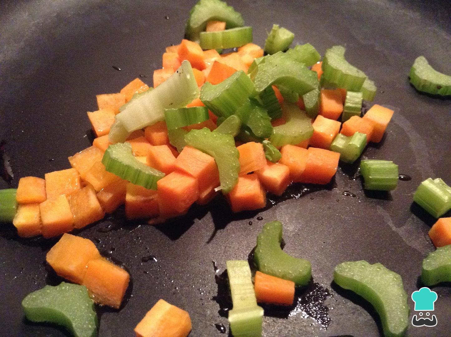 Lleva una sartén a fuego medio, adiciona un poquito de aceite de oliva o de girasol y agrega el apio y zanahoria cortados en cubos. Deja saltear durante algunos minutos hasta que observes que se encuentran blandos. Agrega sal y pimienta al gusto. En esta receta quise destacar los dos ingredientes principales que son la zanahoria y el apio, pero si deseas puedes añadir más vegetales a la receta para adelgazar.