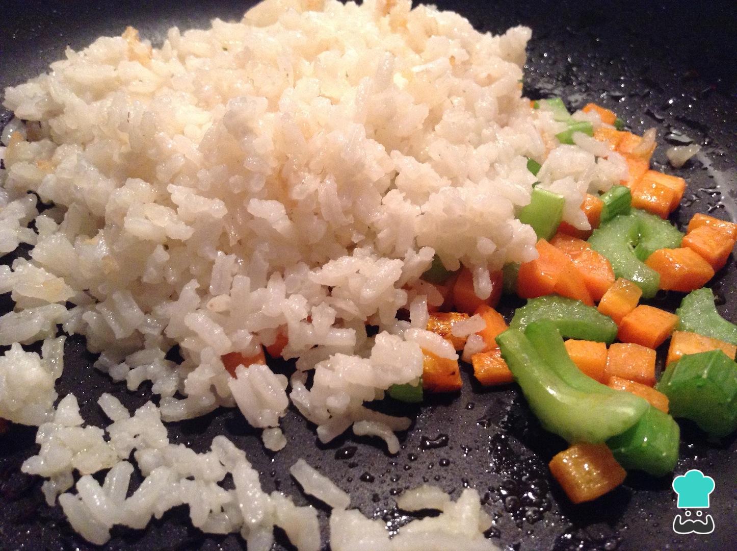 Una vez observes que los vegetales están blandos, añade el arroz blanco a la sartén y baja el fuego, mezcla muy bien todos estos ingredientes y rectifica sabor. Si lo consideras necesario, puedes añadir un poco de ajo en polvo. Deja conservar a fuego lento la preparación y apaga el fuego.