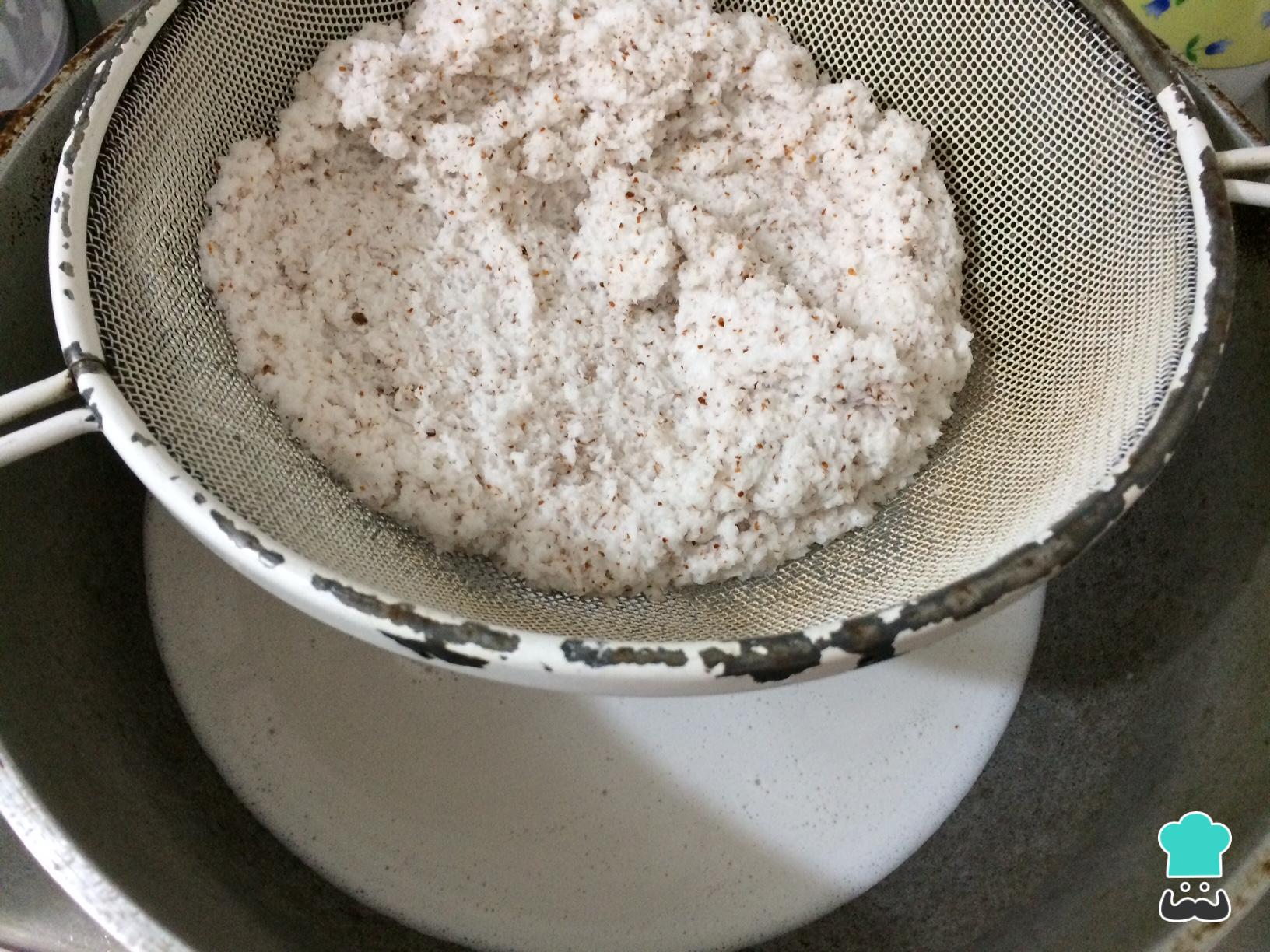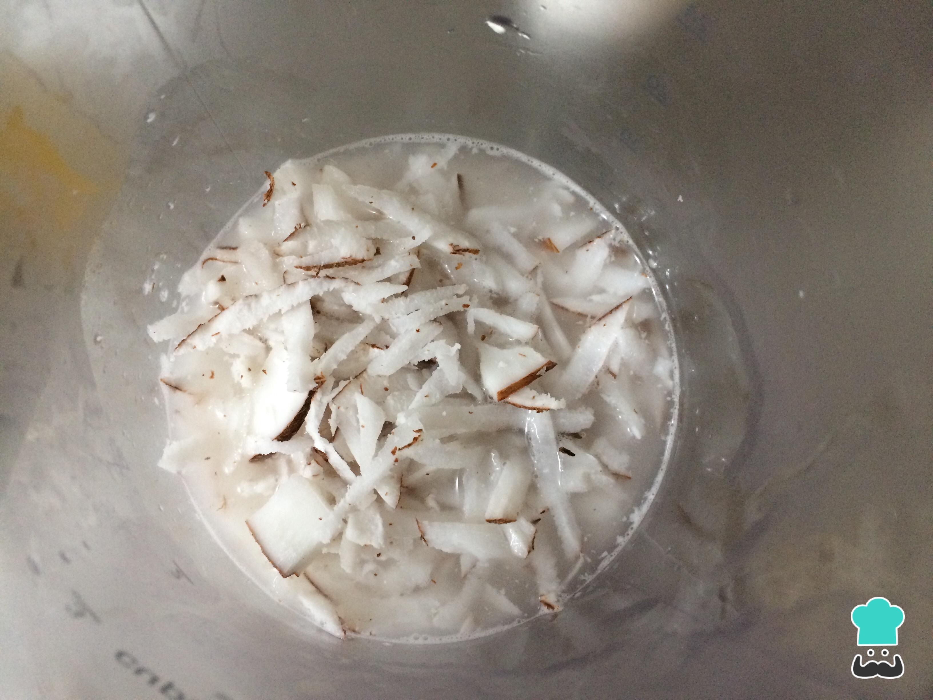 Partir el coco con mucho cuidado, con ayuda de un martillo si es necesario. Retirar el agua, pelarlo, rallarlo y licuarlo con dos tazas de agua caliente.